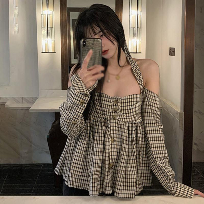 Характеристики: линия плеча, клетка, воротник-хомут, подтяжки, рубашка, женская, винтажная, короткая, с длинным рукавом, топ