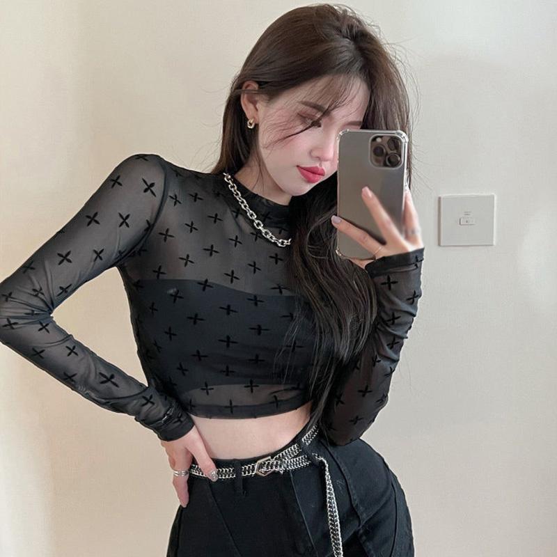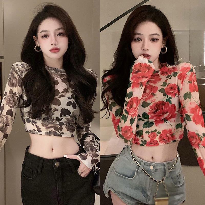 Тонкая футболка с цветочным принтом в стиле ретро для женщин, тонкая сетка, прозрачный укороченный топ с длинными рукавами, летние повседневные универсальные накидки