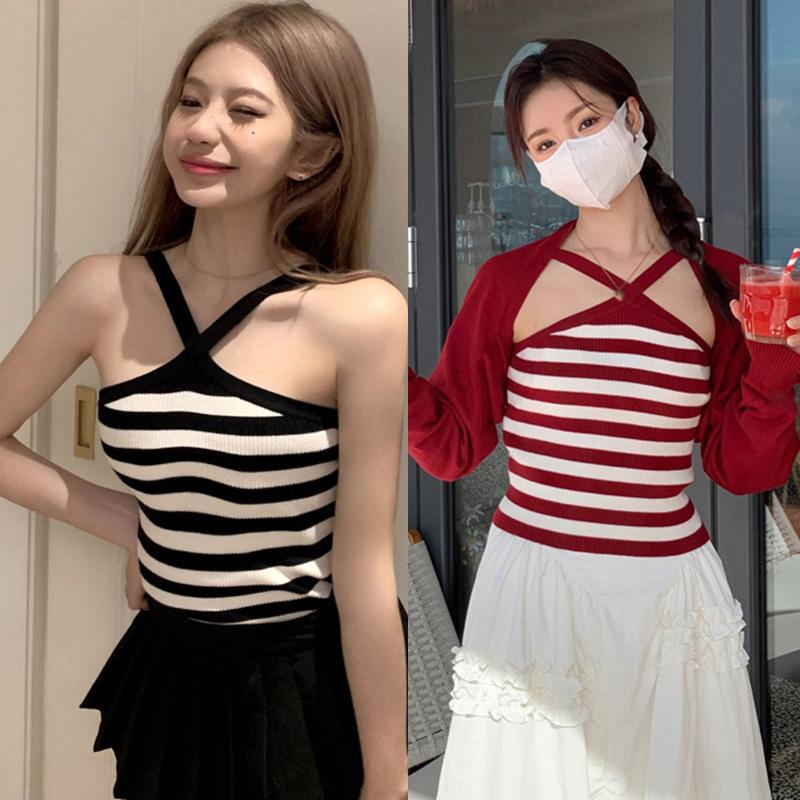 Женские летние тонкие универсальные топы в полоску с бретельками
