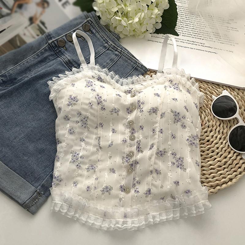 Майки с цветочным принтом, женские укороченные топы на бретельках с кружевной отделкой, майки на тонких бретельках