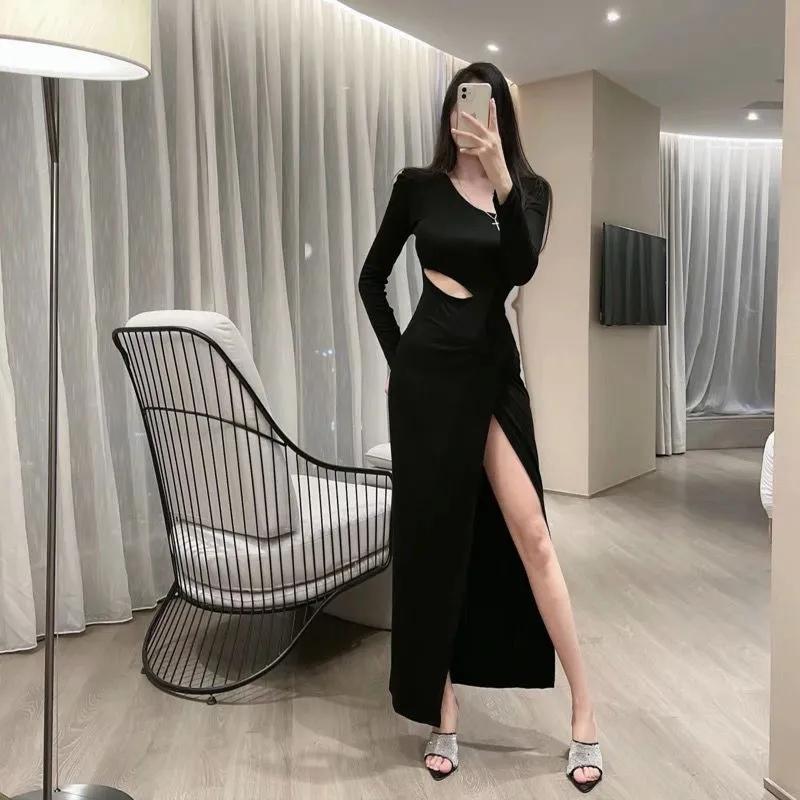 Облегающее платье с запахом, тонкое платье с разрезом, женское офисное платье с вырезом, черные платья, наряды Y2k, корейская мода, новинка