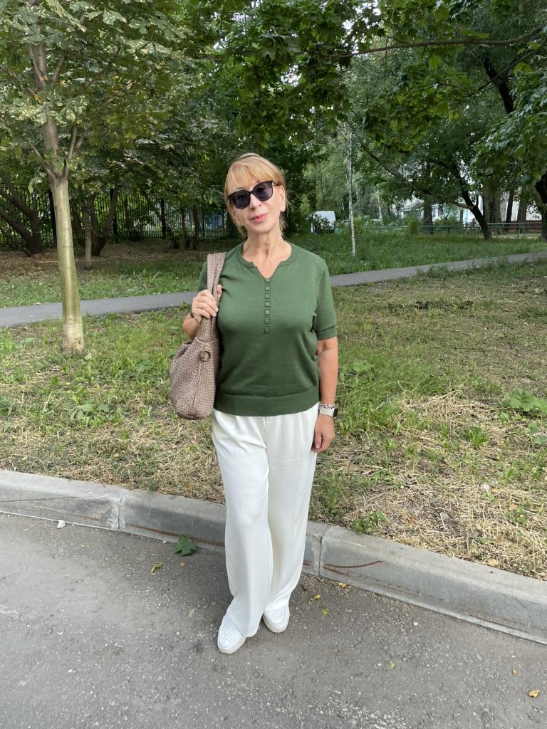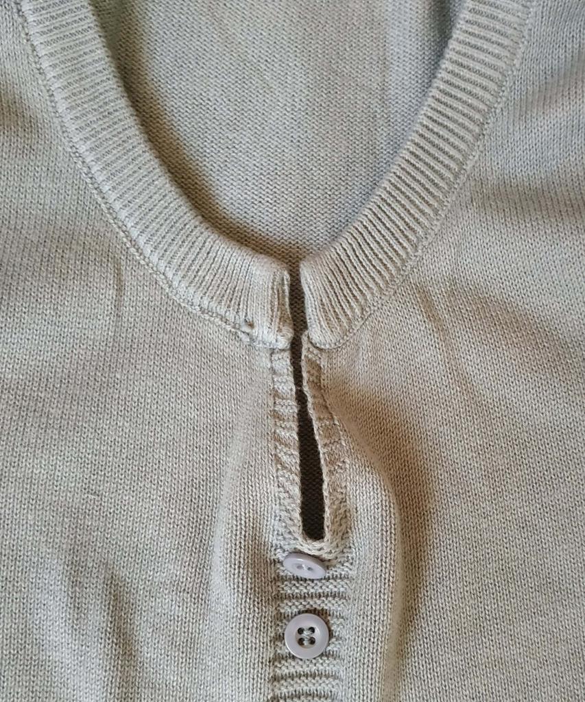 Это совсем не футболка, как написано, а трикотажная кофточка. Цвет приглушённый. Нитки, похоже, х/б. К качеству претензий нет, всё аккуратно, только форма горловины не очень мне понравилась. Подумала было сколоть брошью-булавкой, но не получится, так как будет оттопыриваться (фото 2). Плотная кофточка, не для жары.