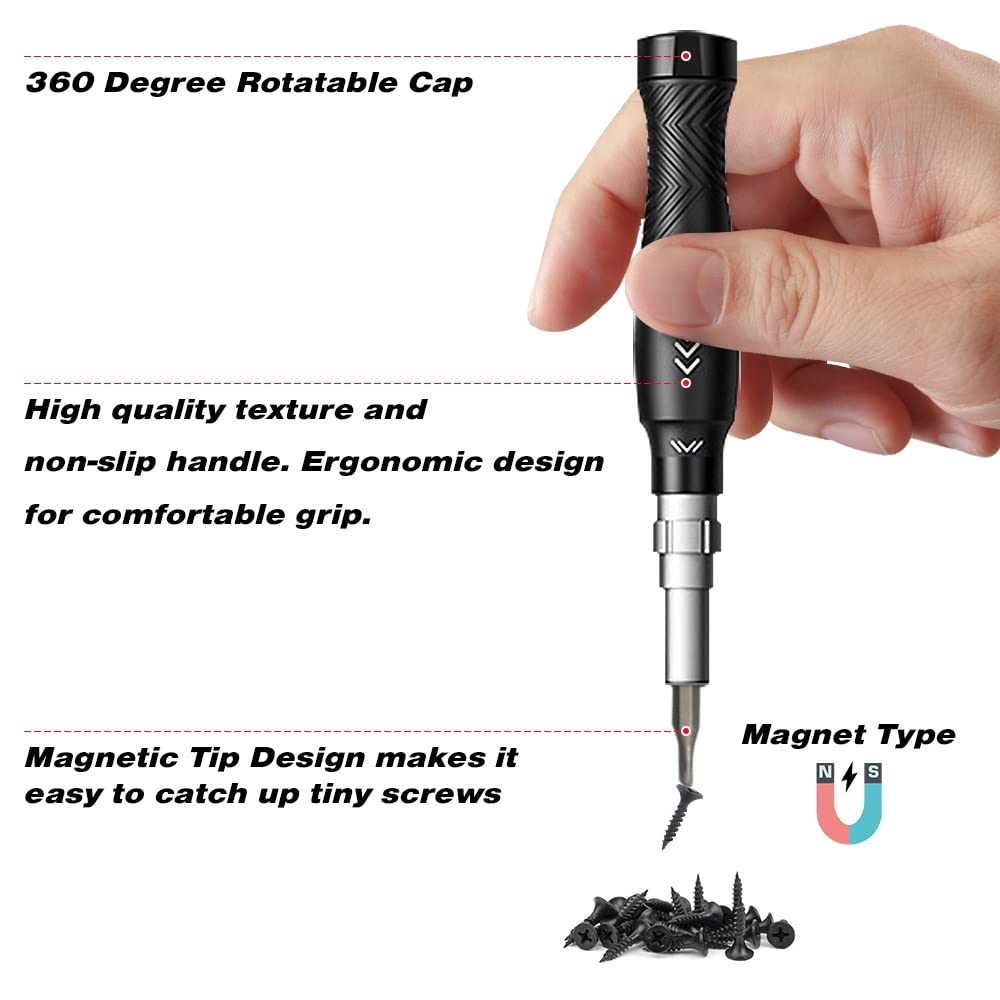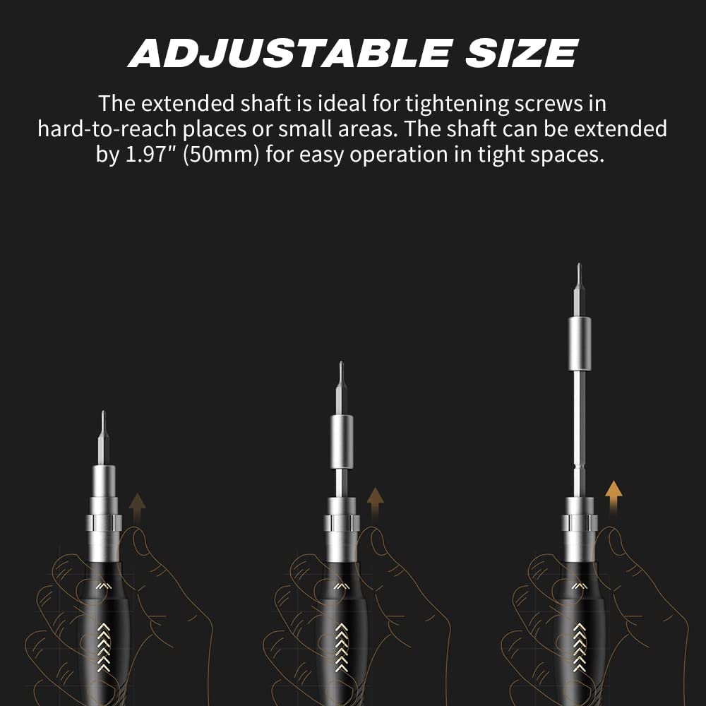 【ГУМАНИЗИРОВАННЫЙ ДИЗАЙН】Нескользящая и регулируемая ручка прецизионной отвертки со встроенным удлинительным валом с 3 регулируемыми длинами облегчает использование даже в узких пространствах.. Магнитный держатель бит из легкого материала. (алюминий) передает магнетизм через насадку отвертки и помогает справиться с крошечными винтами. Вращающийся на 360° колпачок и противоскользящая зона обеспечивают лучший контроль в руке.