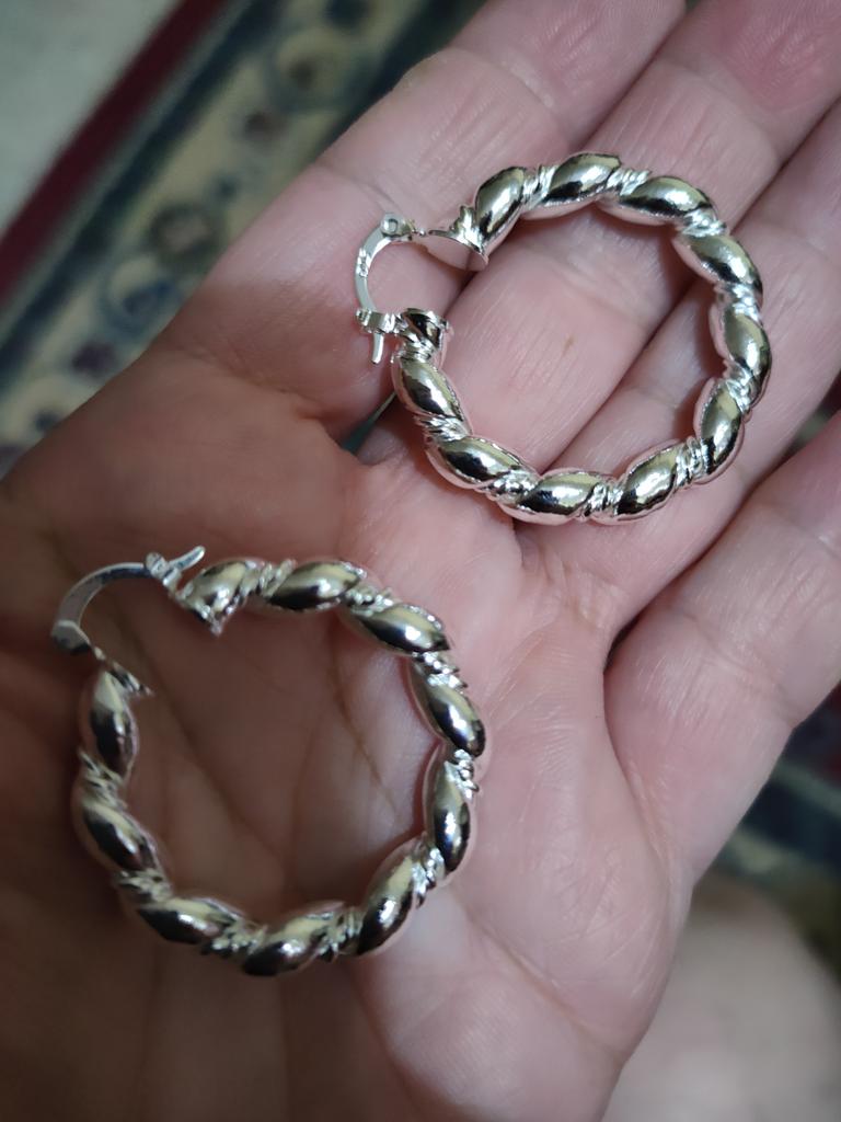 Думала, что колечки будут чуть меньше. Они среднего размера. У одной серёжки застежка тугая, у другой наоборот. Но качество хорошее, проба стоит, но думаю, что сплав под серебро. Остальное без претензий. Спасибо