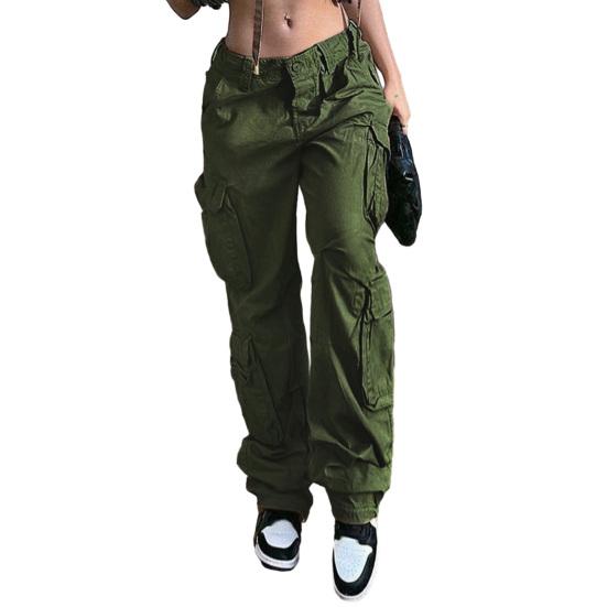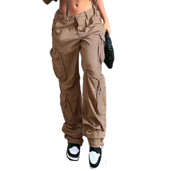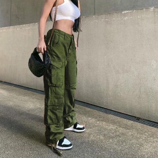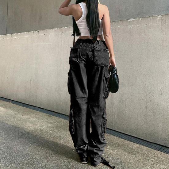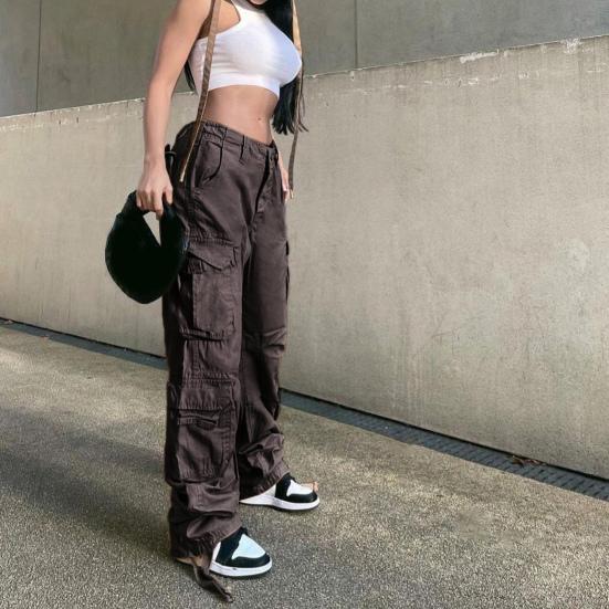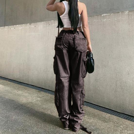 Женские брюки-карго с эластичной талией в стиле хип-хоп, однотонные, с несколькими карманами, мягкие свободные прямые винтажные брюки с высокой талией, уличная одежда, женские длинные брюки на шнурке