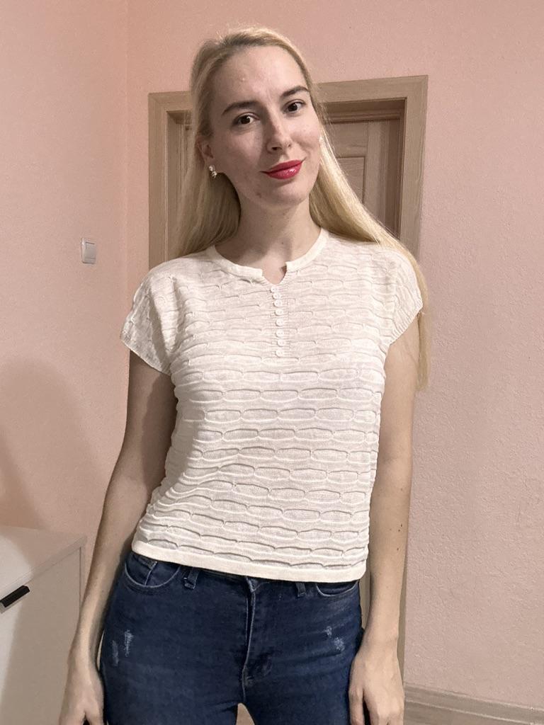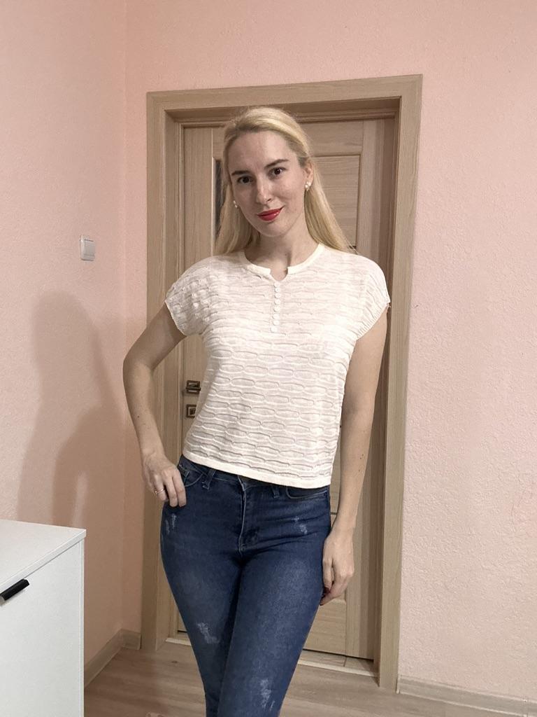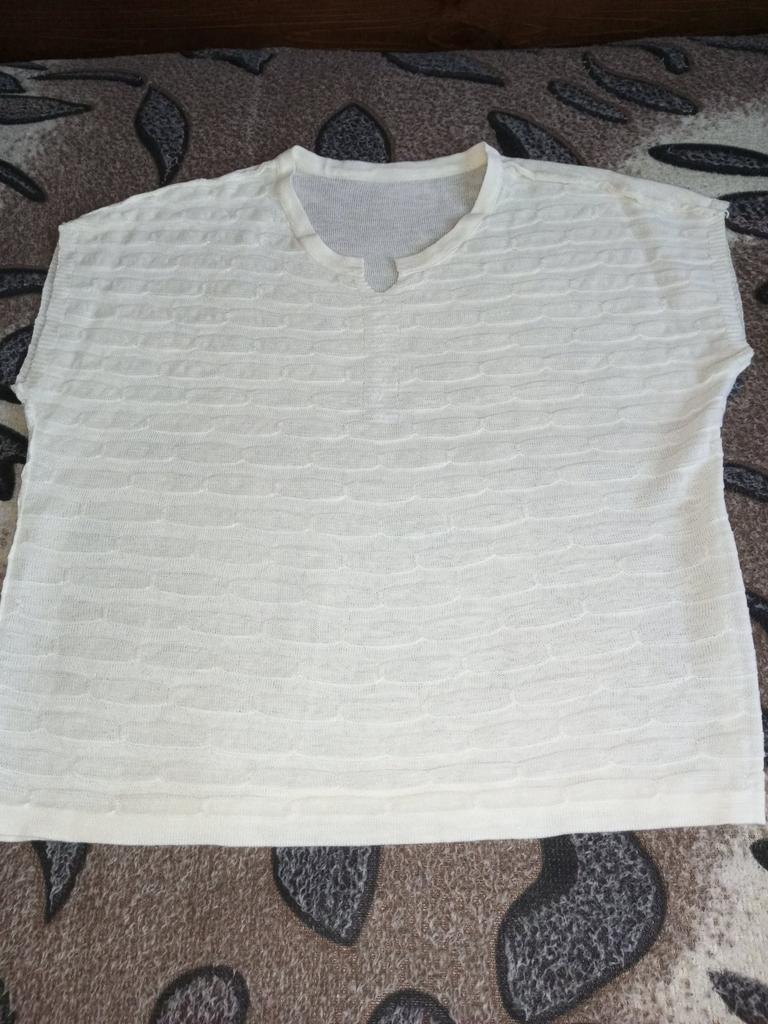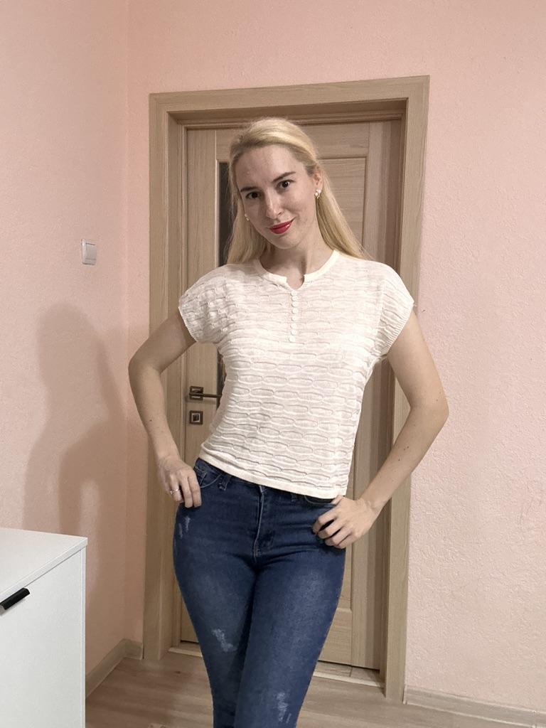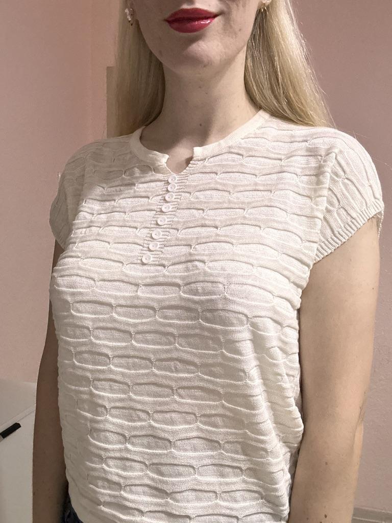 Заявленная футболка прибыла в сборной посылке. По моим параметрам от80-81 село как и хотелось, под грудью85 , по груди 95 села футболка чуть свободно, не в обтяг, как и хотелось. Качество хорошее, даже могу сказать отличное, без торчащие ниток, ровные швы, пуговицы пришиты хорошо. Длина чуть ниже талии, что нравится. Материал тонкий трикотаж, похоже из двунитки, одна нить чуть с блеском белая, другая матовая немного цвет топленого молока. Ощущение немного шелковистая, строится, приятная и чуть "тяжеленькая".Тонкая в меру, чуть просвечивает, но не критично. Создаётся эффект лёгкости и смотрится благородно. Удачная покупка. Понравилась футболка, (кофточка) . Спасибо продавцу и джум🥰🥰🥰
