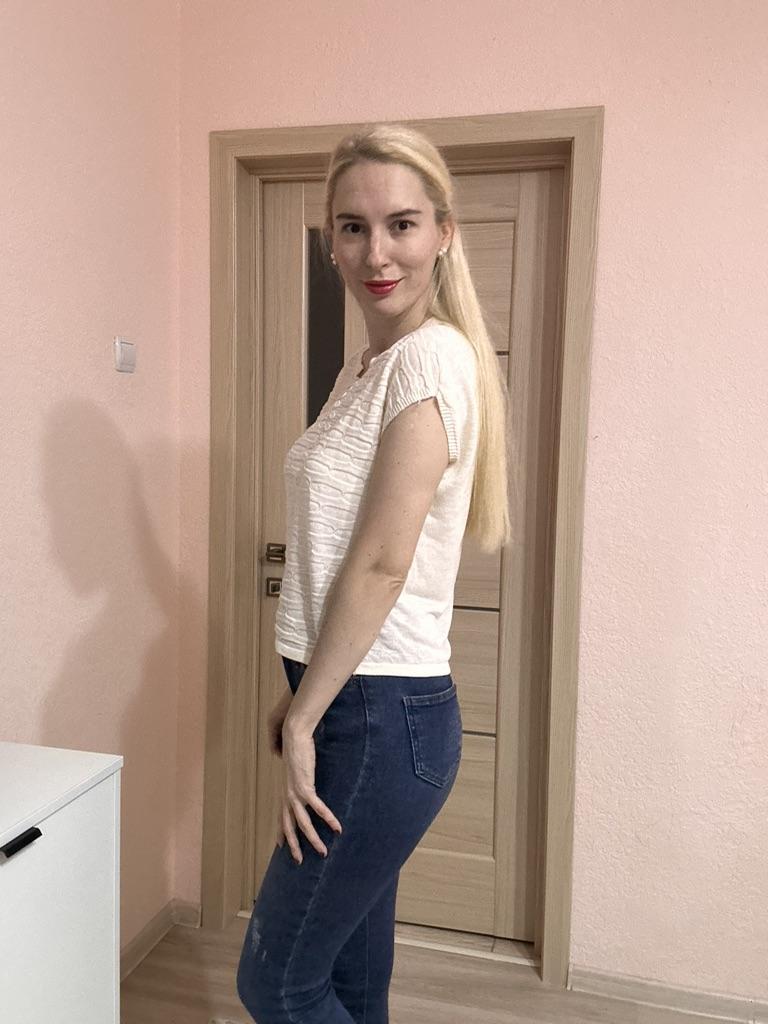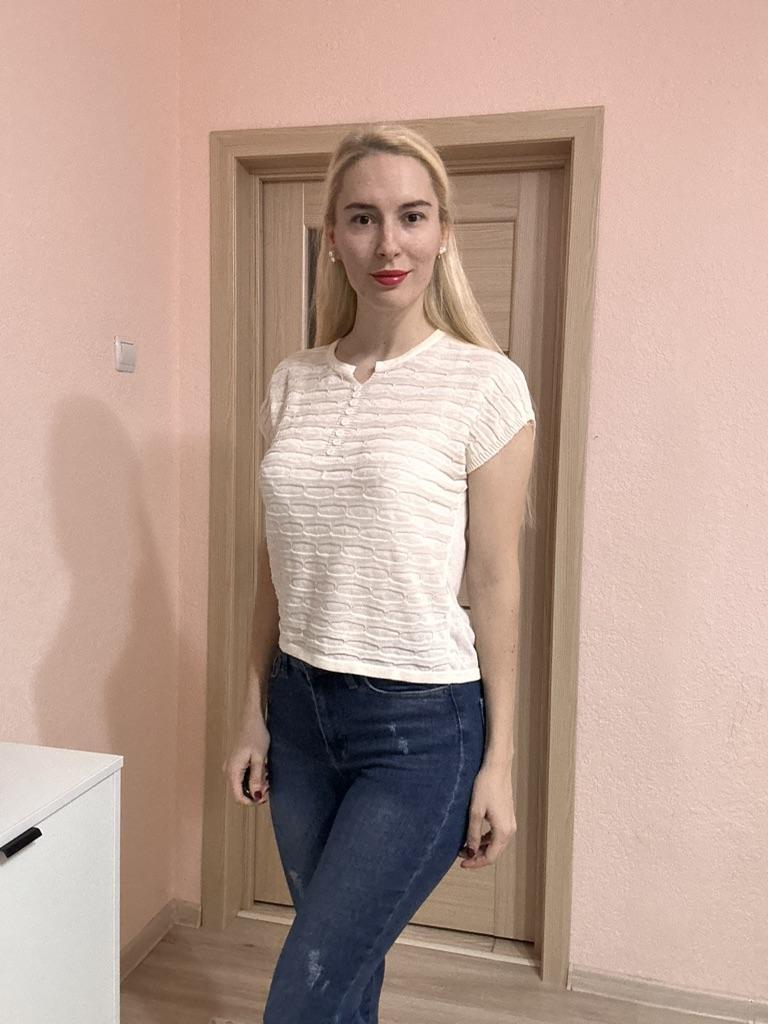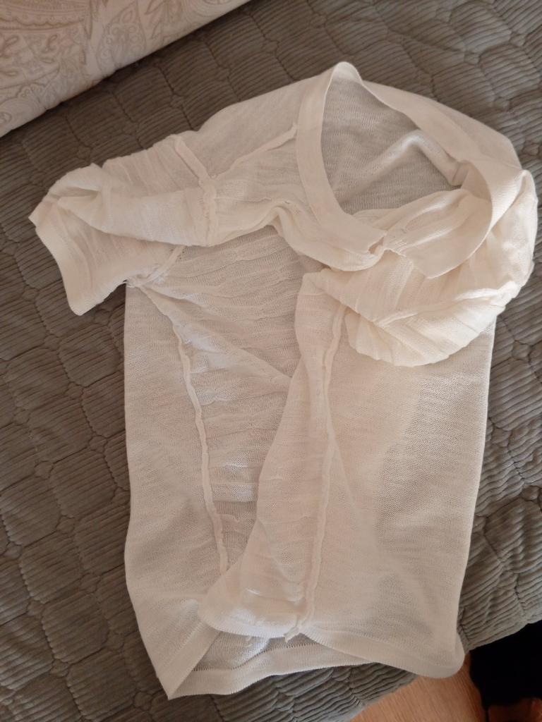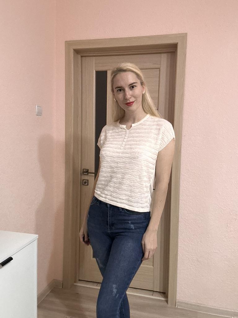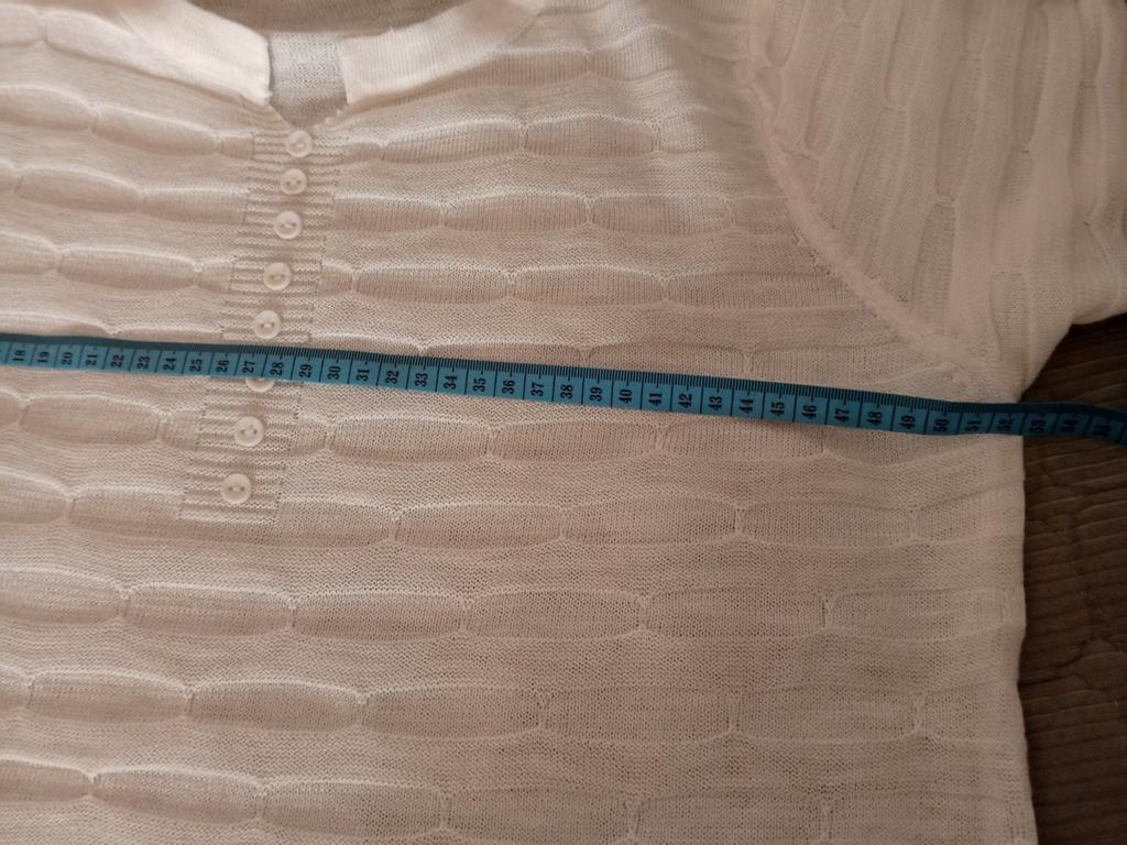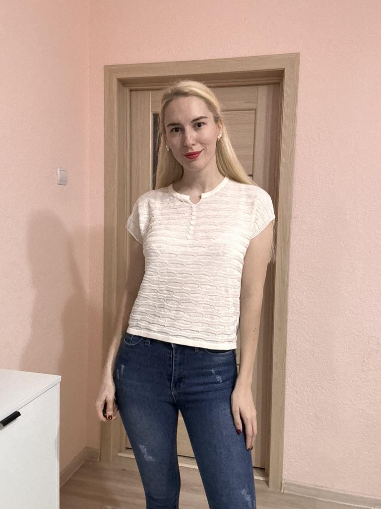 Заявленная футболка прибыла в сборной посылке. По моим параметрам от80-81 село как и хотелось, под грудью85 , по груди 95 села футболка чуть свободно, не в обтяг, как и хотелось. Качество хорошее, даже могу сказать отличное, без торчащие ниток, ровные швы, пуговицы пришиты хорошо. Длина чуть ниже талии, что нравится. Материал тонкий трикотаж, похоже из двунитки, одна нить чуть с блеском белая, другая матовая немного цвет топленого молока. Ощущение немного шелковистая, строится, приятная и чуть "тяжеленькая".Тонкая в меру, чуть просвечивает, но не критично. Создаётся эффект лёгкости и смотрится благородно. Удачная покупка. Понравилась футболка, (кофточка) . Спасибо продавцу и джум🥰🥰🥰