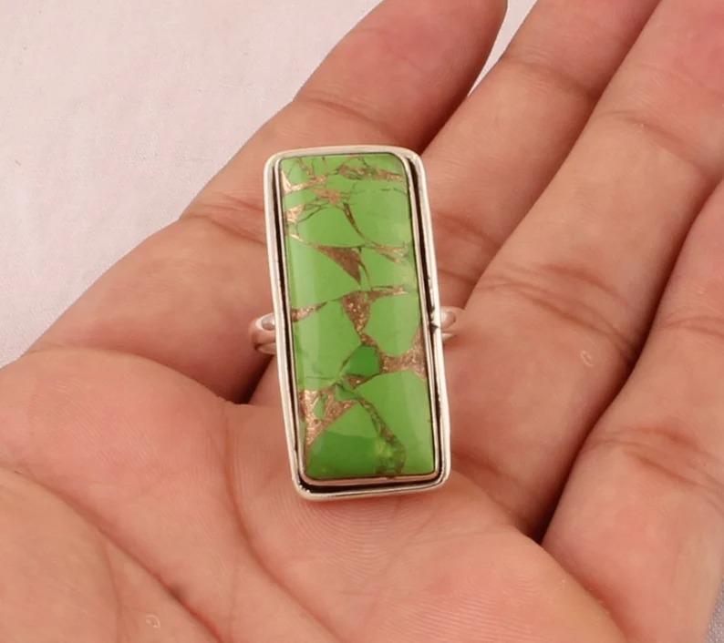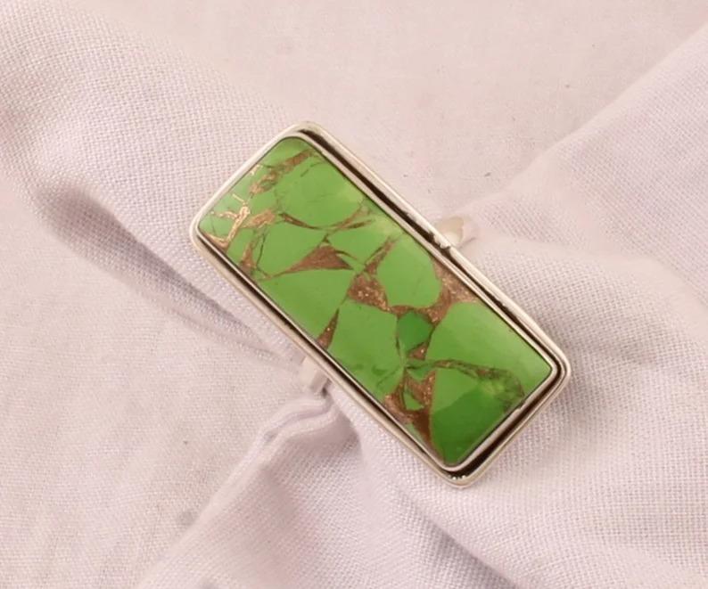 Прямоугольное кольцо с зеленым медным бирюзовым камнем, серебро 925 пробы, ювелирные изделия ручной работы, кольцо с безелем, эффектное кольцо, праздничное кольцо