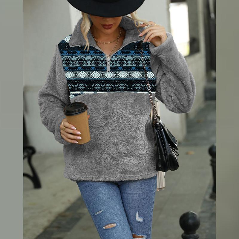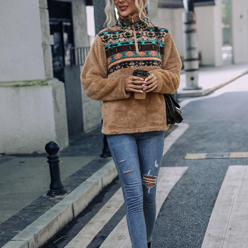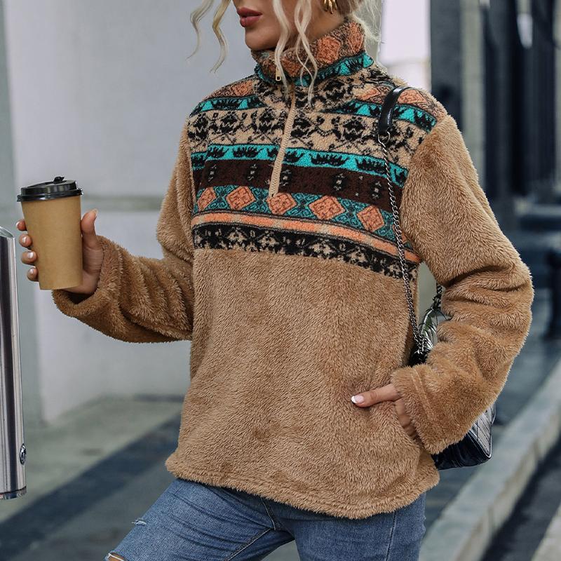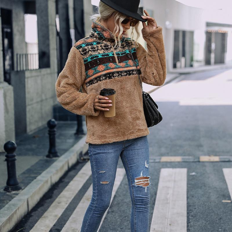 Плюшевый свитшот с длинными рукавами, женский свободный пуловер с воротником-стойкой, карманом и половиной молнии