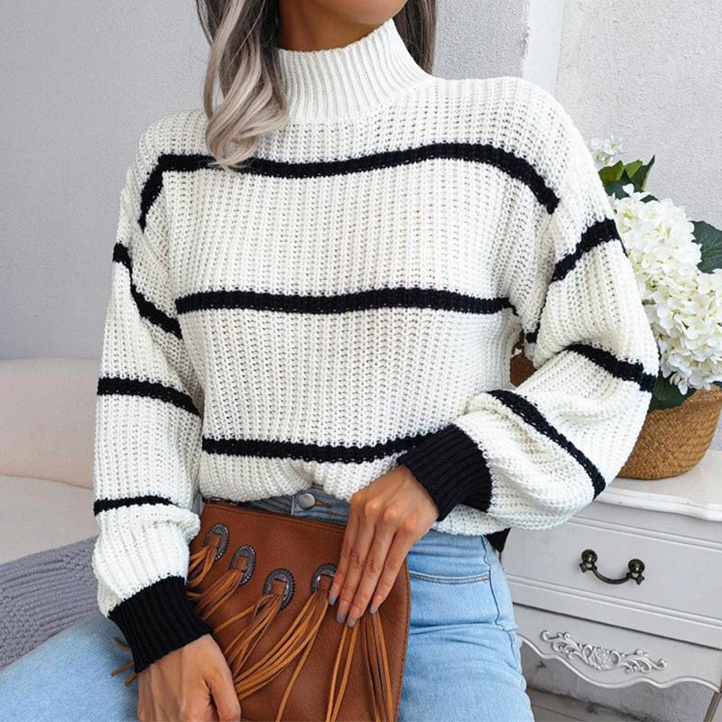 Повседневный полосатый свитер, женский свободный вязаный топ с рукавами-фонариками, полуводолазка — купить товар онлайн с бесплатной доставкой по всему миру!
