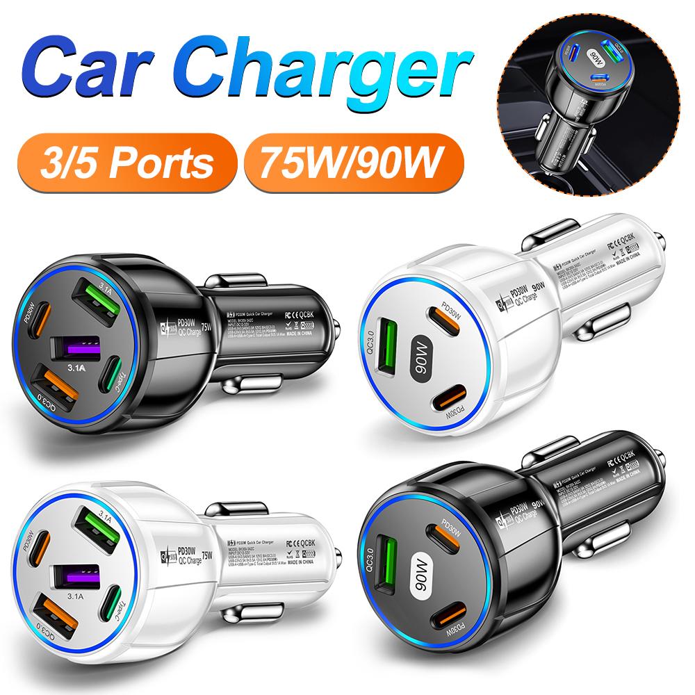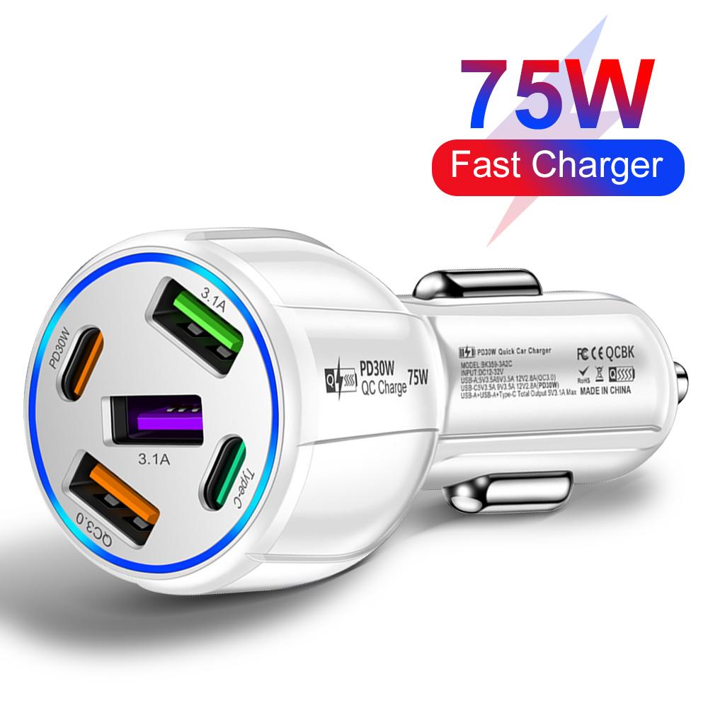 5 портов 75 Вт Автомобильное зарядное устройство для быстрой зарядки Pd Qc3.0 Автомобильное USB-зарядное устройство типа C Зарядное устройство для телефона в автомобиле для Iphone Xiaomi Huawei Samsung