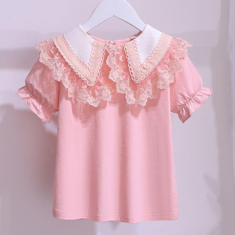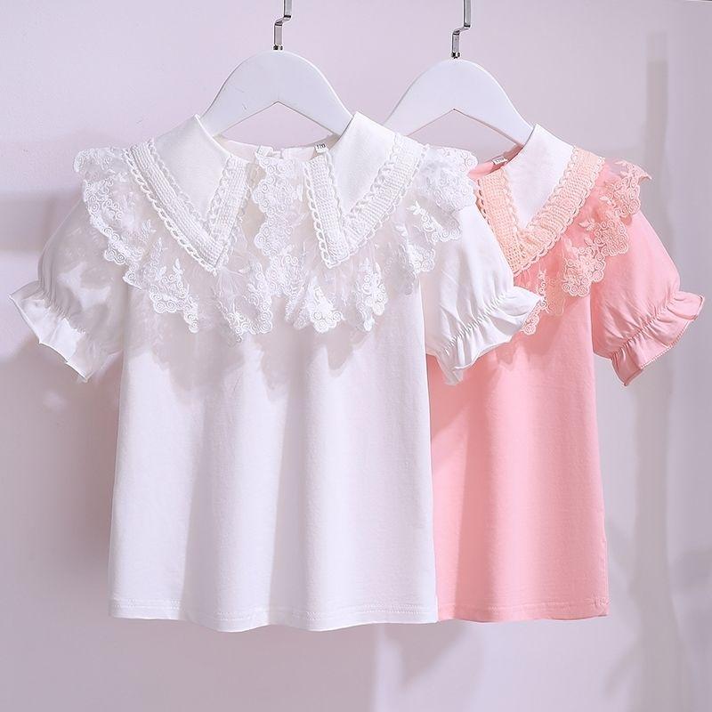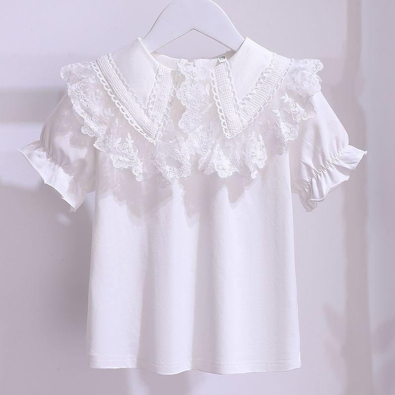 Летняя белая футболка с короткими рукавами для девочек, новинка 2022 года, хлопковая детская кружевная блузка с лацканами для подростков, школьная одежда для детей, топы для детей от 3 до 12 лет