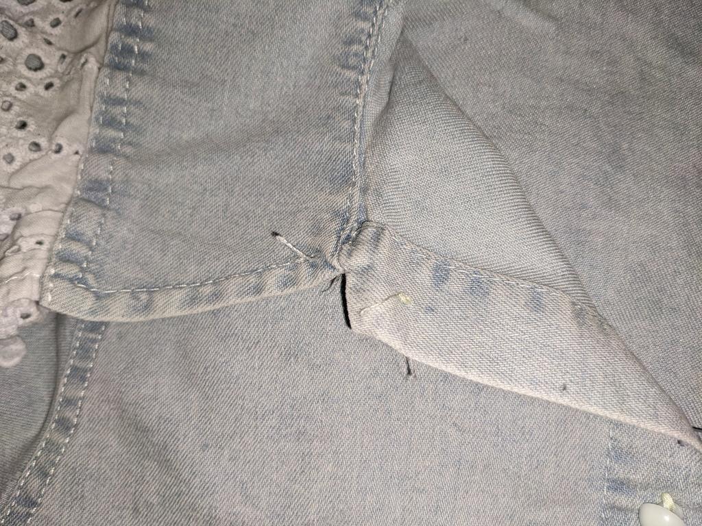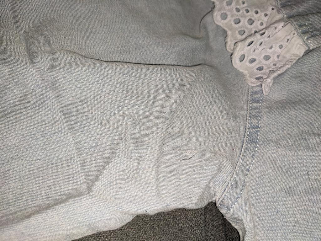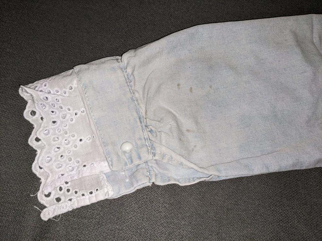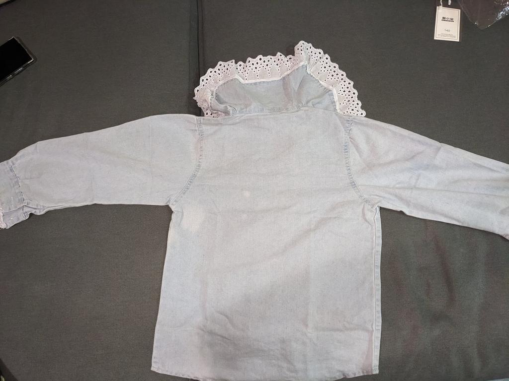 Блузка из очень тонкой джинсы, нитки кое-где торчали, но не критично. На очень худенькую девочку, 124 см ростом рукова немного длиноваты