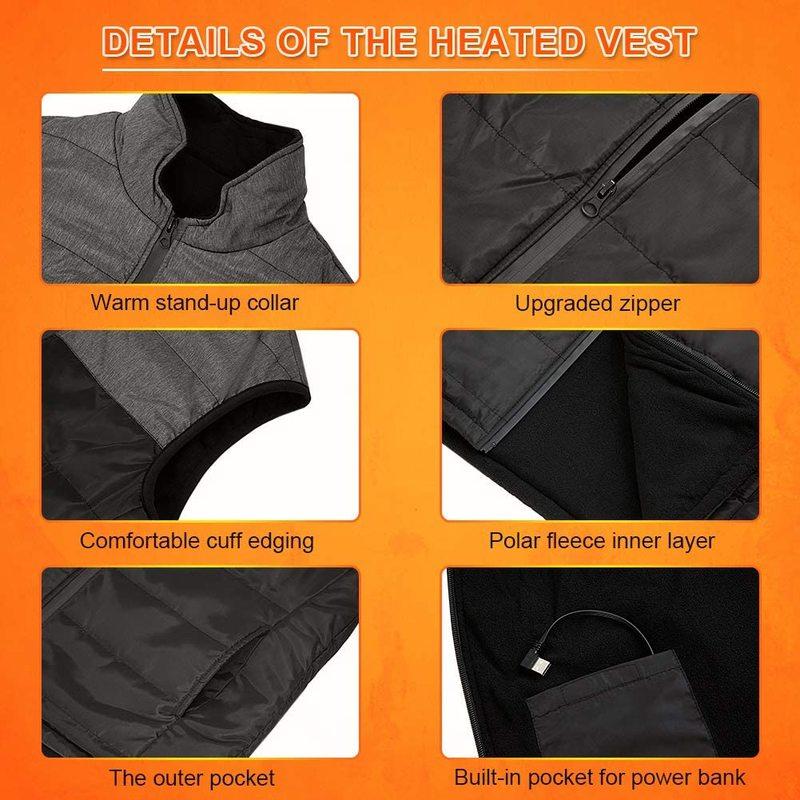 В холодную зиму нам нужно носить много одежды, чтобы согреться, что делает наше движение очень медленным и неудобным.. Надев этот электрический жилет из полиэфирового волокна, ветрозащитный и теплый, вы можете наслаждаться развлечениями на свежем воздухе, не нося слишком много одежды, такой как катание на лыжах, езда на велосипеде, мотоцикл, рыбалка, кемпинг, охота, гольф, работа на свежем воздухе