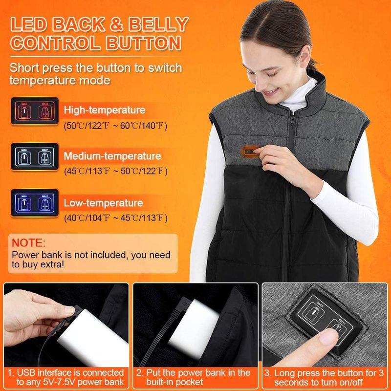 Для мужчин размер жилета с подогревом меньше американского размера. Вам нужно выбрать один размер, превышающий размер тега. Пожалуйста, выберите в соответствии с таблицей размеров перед покупкой. Ниже приведена информация о мужских и женских моделях, вы также можете обратиться к размеру модели, чтобы выбрать. Мужская модель (высота: 186cm/73.2in, бюст: Износ 105 см / 41,3: Тег XL). Модель женского пола (высота: 174 см/68.5 дюймов, бюст: 82 см /32,3 дюйма: Тег M) регулируемый USB-нагревательный жилет принимает новейшую технологию углеродного волокна, имеет 4 нагревательных элемента, может генерировать тепло в воротнике, передней и задней областях, с помощью 2 кнопок управления. Он питается от банка питания 5V 2A / 7.4V 2A (не включено), и имеет встроенный карман для его хранения. 3 уровня регулировки температуры нагрева, высокий (красный)=50-60°C, средний (белый)=45-50°C, низкий (синий)=40-45°C