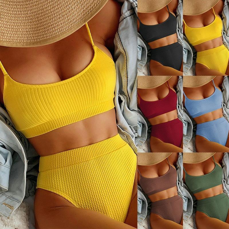 Женский бикини с высокой талией, купальник с пуш-ап, сексуальный комплект бикини с высоким вырезом в рубчик
