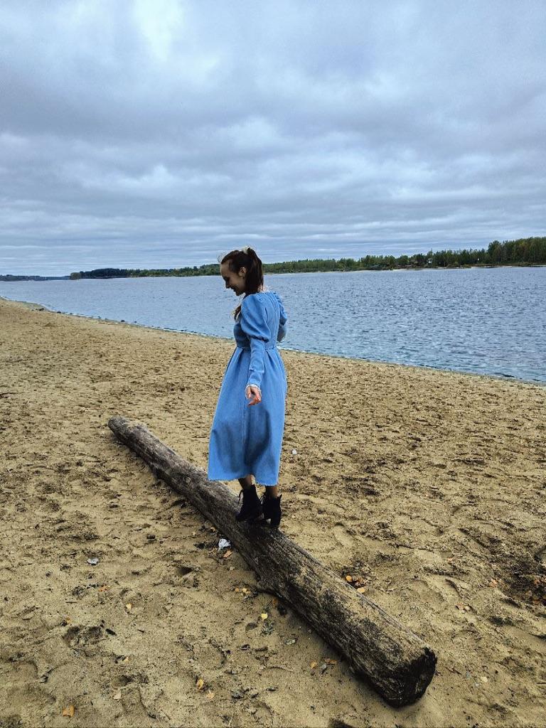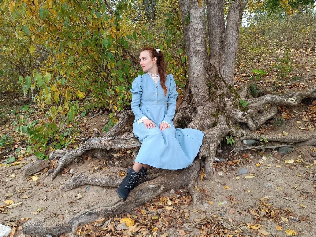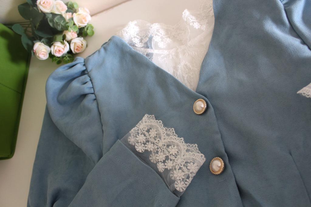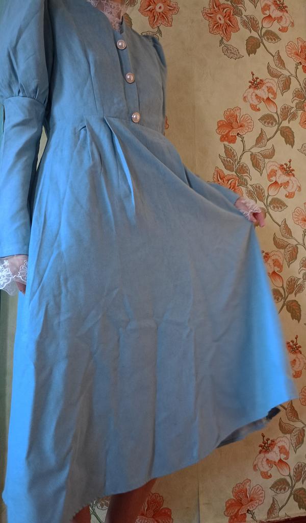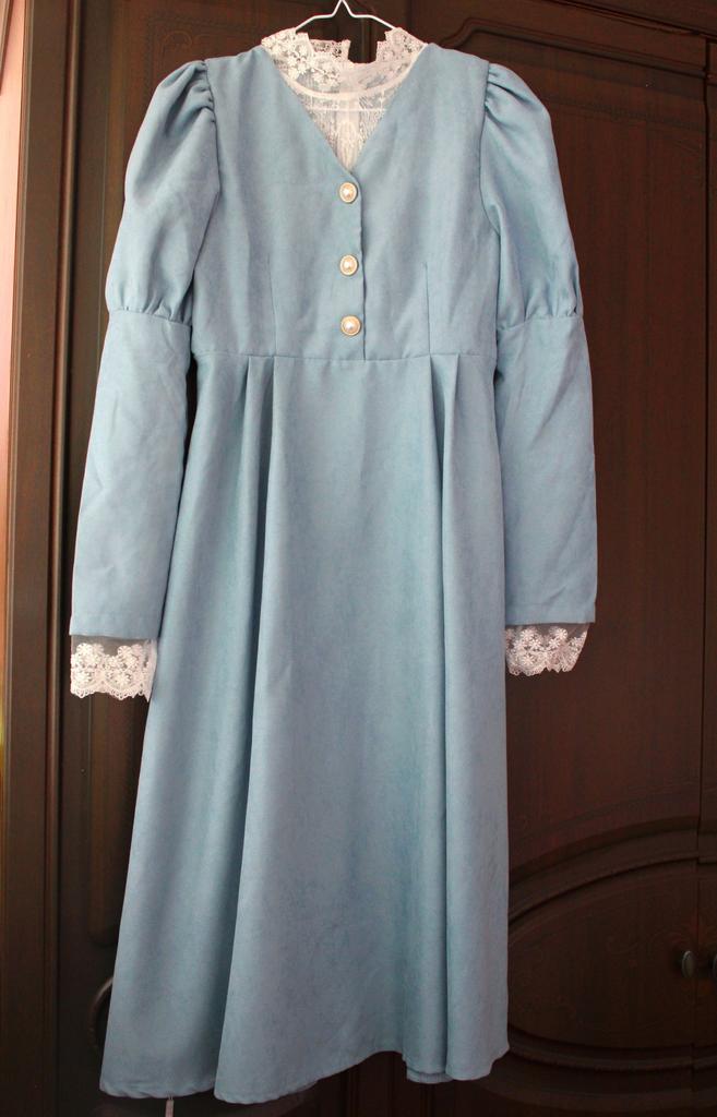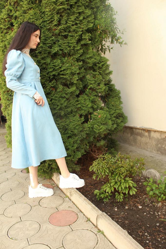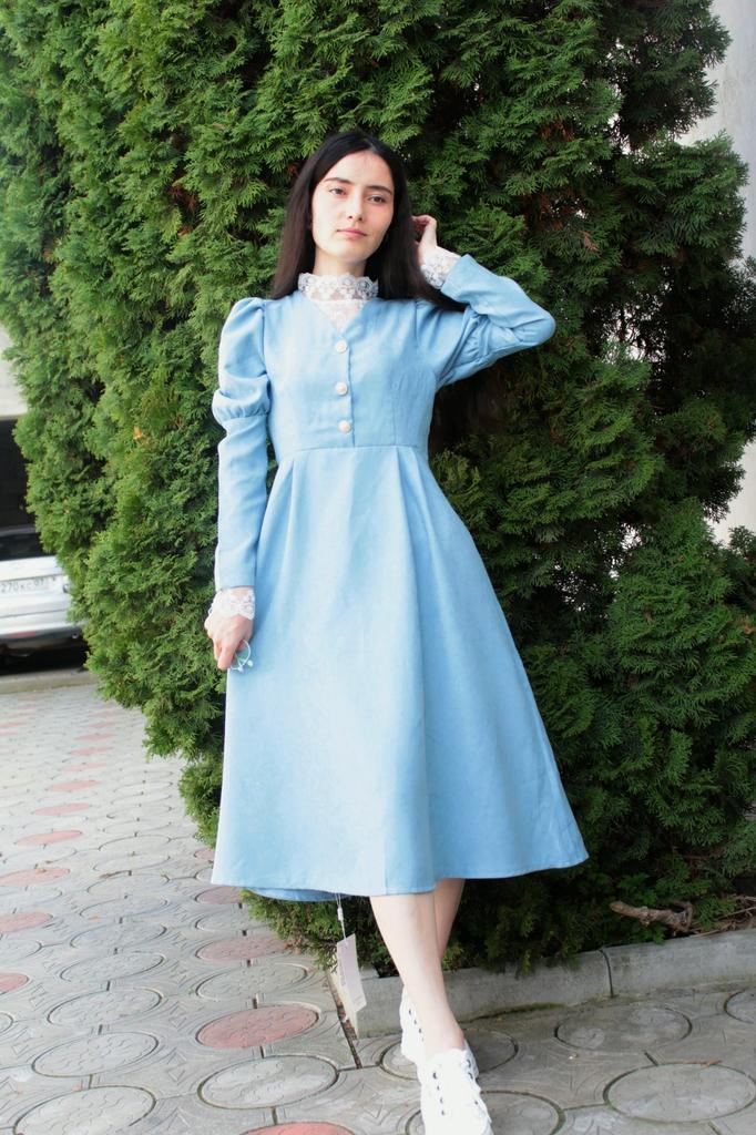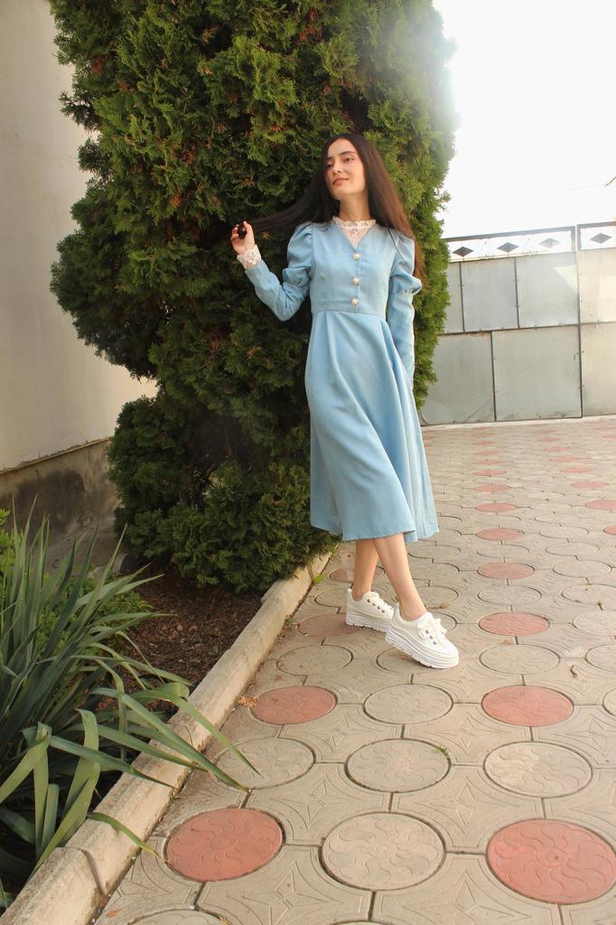 Платье 🌊 Платье в романтическом стиле из микровельвета 🤍 Поистине платье принцессы 💫 Итак, платье длины миди, на мой рост 166 см почти до середины голени. Крой приталенный, рукава буфы также смотрятся изысканно. Закрывается сзади на потайную молнию. Юбка -трапеция, с двумя небольшими складками под талией. По краю рукава и у горловины декорировано белым кружевом. Пуговицы среднего размера, в виде жемчужин в золотой оправе.✨ Цвет пыльно-голубой, очень красивый. 🌊 Ткань микровельвет, на весну и теплую осень отлично подойдёт. На мои параметры 78-60-93 я заказала размер S, и он слегка свободен в талии. Поначалу думала подогнать, но и так неплохо смотрится) Кружево у горла можно подогнуть, если вдруг не хочется совсем закрытое декольте. Так же, как и на рукавах) В целом, платюшко прелестное, с белыми кроссовками круто сочетается 🤍 Я думаю, стоит носить именно с такой обувью, дабы осовременить образ и получить такой модный микс стилей 🔥