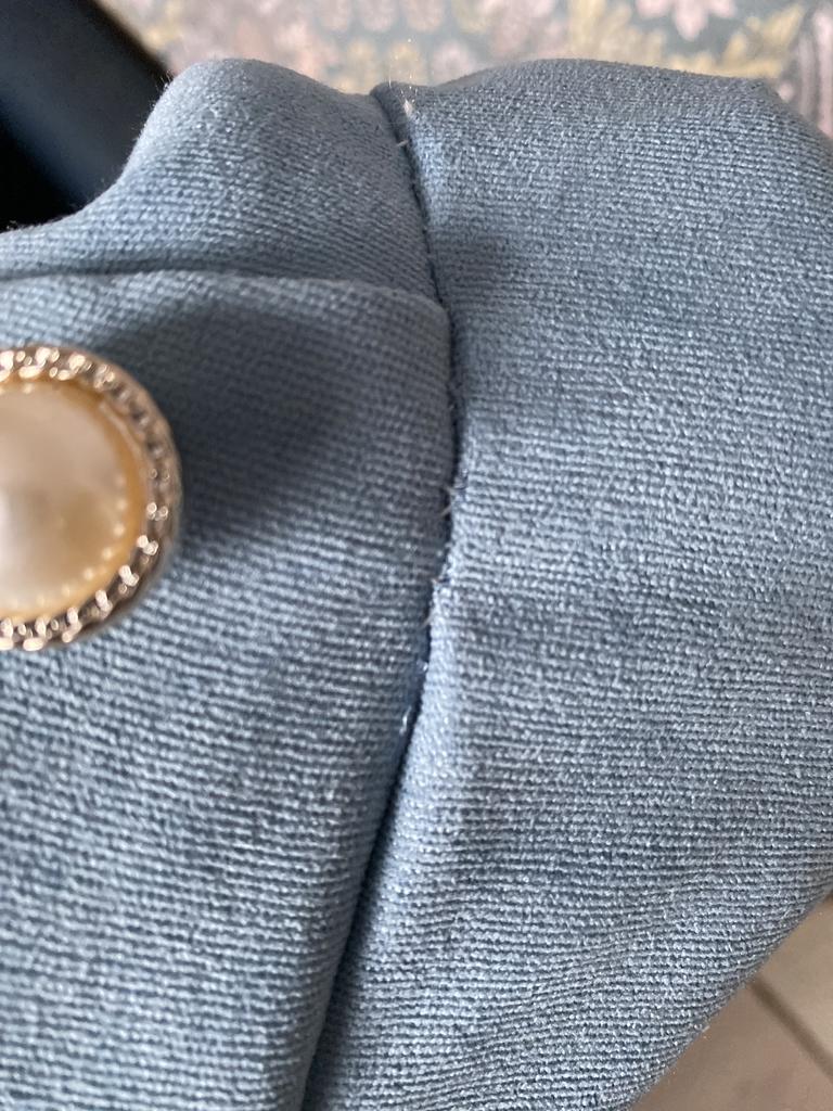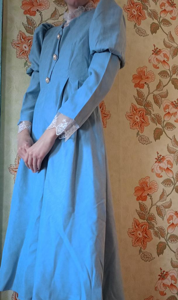 Несоответствие фото и товара. Платье для тех, у кого вообще нет груди (максимум, 1 размер). Узкие в предплечьях рукава, поврежденная фурнитура (жемчужные пуговицы все исцарапаны). Разная длина у воротника сзади, кривые необработанные края, очень много неровных швов и торчащих ниток. Подол спереди примётан вручную. На самом платье в нескольких местах есть точки грязи. Прошу вернуть деньги.