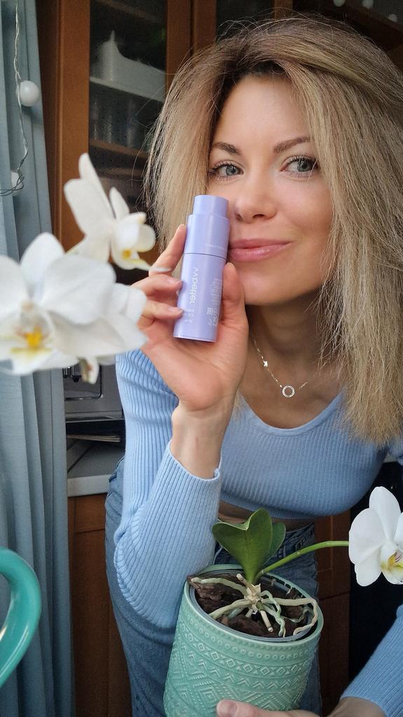Корейский крем для кожи вокруг глаз. Пришел в коробке, замотанный в пупырку. На упаковке защитная наклейка. У средства очень интересный дизайн! Туба красивого нежно-лилового цвета. Похоже на тюбик с помадой, но больше. Чтобы открыть, надо нажать на верх и прокрутить верхнюю часть. Выдвигается дозатор, и можно легко получить нужное количество крема. Крем полупрозрачный, гелеобразный, хорошо скользит по коже. Запах слабый, пудровый. Приятно холодит кожу. В составе хочу отметить бакучиол, который уменьшает морщинки и восстанавливает эластичность и упругость кожи, улучшает ее текстуру и делает ровным тон. Ещё там есть витамин С; Гидролат зелёного чая; Ниацинамид; Карнозин; Экстракт коры амурского пробкового дерева Комплекс пептидов; Масло герани, базилика, лаванды, апельсина, пеларгонии; Экстракты филодендрона, центеллы азиатской, семян какао и фигового дерева. И множество других полезных веществ. Наносим чудесный кремушек на верхнее веко и под глаза. Днём он может служить праймером, а при нанесении вечером работает ночью, пока вы спите. Утром проснетесь красивая и молодая!