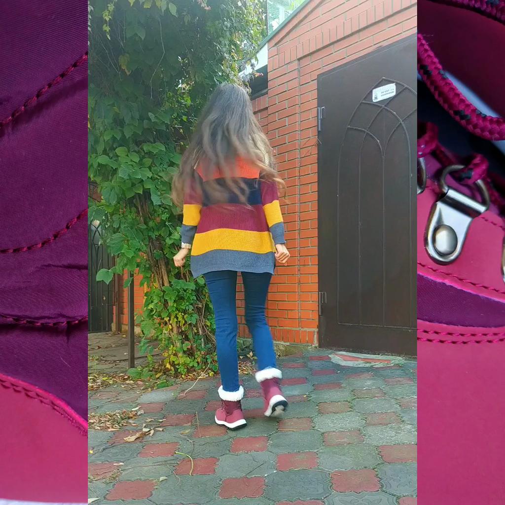 БОРДОВЫЕ БОТИНКИ НА ШНУРКАХ TUINANLE👣 + видео Тот вариант, когда хочется не только черные или белые ботинки. Увидела в бордовом цвете и захотела Посылка пришла за 21 день. Упаковано в почтовый пакет и был индивидуальный и пупырки пакет. Внутри были вставки из пенопласта. При транспортировке обувь не пострадала и не помялась. Запаха постороннего не было Когда распаковала - настроилась. Они были в полосках расчерченных под строчку. С помощью влажных салфеток все легко удалилось. Фух! Если у вас также будет, вымывается Начну с цвета. У продавца они бордовые с теплым отливом в рыжину, а на самом деле они ближе к холодному фиолетовому. У продавца есть ещё чёрные и белые Сделаны боты по мотивам кроссовок, только ещё мех добавили. Материал комбинированный. Основа - текстиль, аля болонья. А вот спереди и пятка - пу матовый материал, на кожзам не похоже. И верх с мехом Спереди на ботинках шнурки. Шнурки бело-черные, гармонично смотрятся. Шнурки на металлических петлях Сверху декор в виде густого и пушистого меха. Хоть он и искусственный, но очень приятный. Внутри продолжение этого меха. Мех густой, пушистый и его много. Тепло будет. Стелька тоже меховая, по цвету отличается Подошва, как говорит моя мама, тракторная, с протекторами. Она как у кроссовок. А ещё она какая-то как резина, не скользит. Спереди подошва - 2.5 см, сзади - 3.5 см Взяла 38 размер, по стельке это - 24 см. На мой 36 есть запас, зато ноге так комфортно. Хоть они и объемные, но на ногте смотрятся хорошо. Вес одного ботинка - 400 г, но комфортно. С леггинсами или джинсами отличный вариант. И цвет красивый, мне понравились БУДЬТЕ ВСЕГДА КРАСИВЫ👸