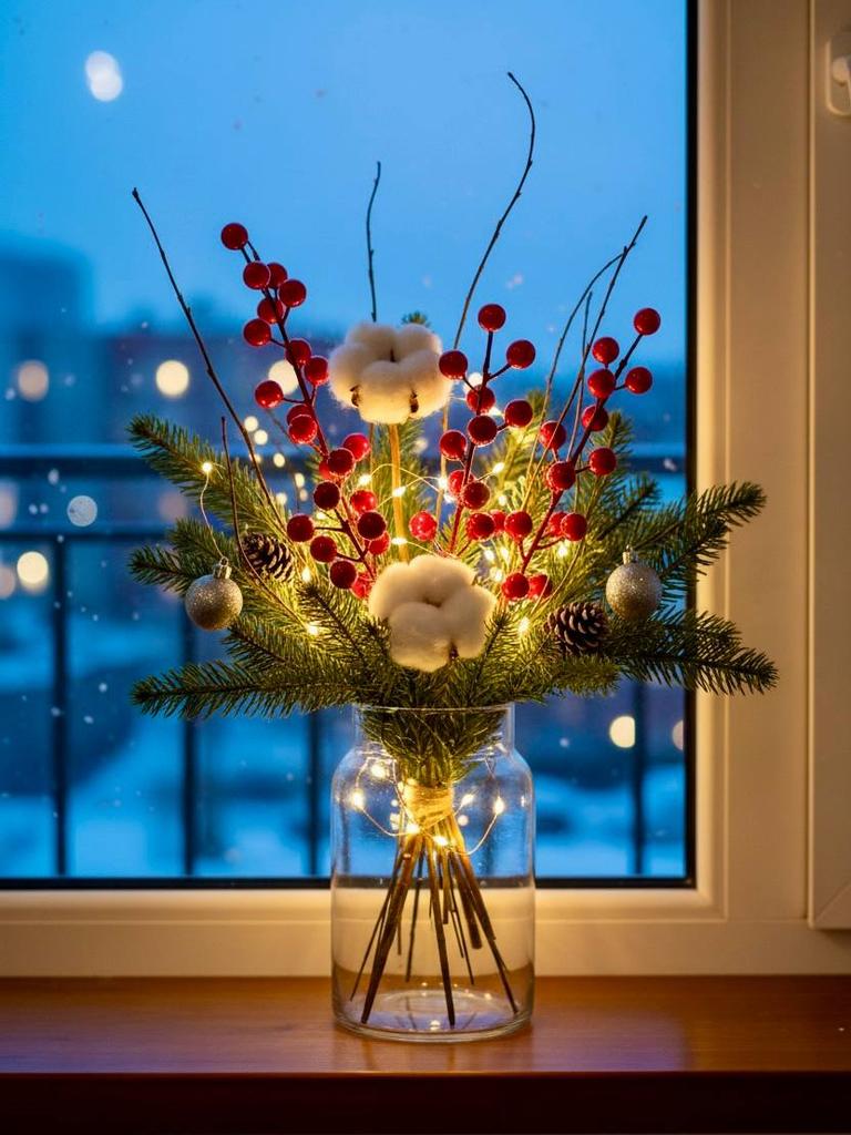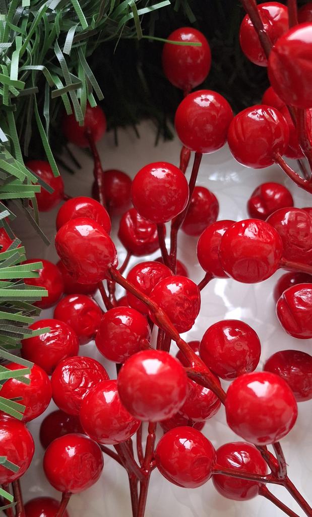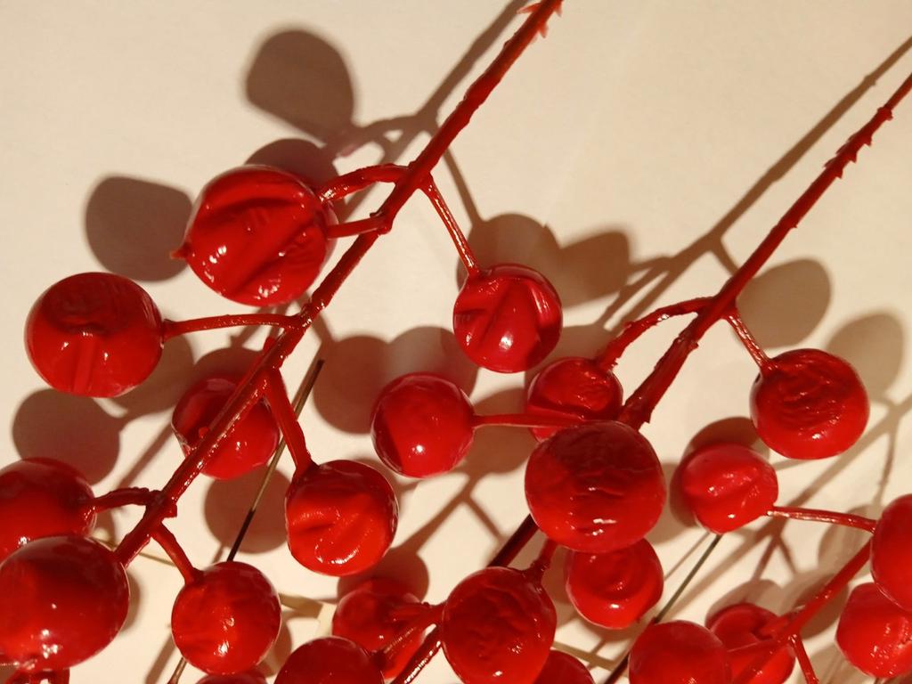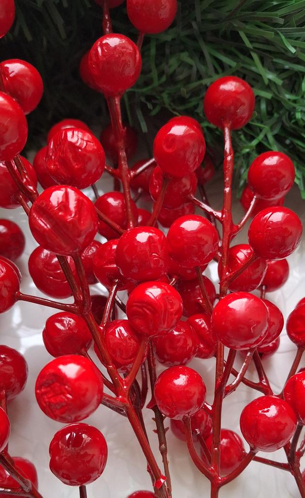 Ветки с имитацией ягод рябины (калины). Ягоды сделаны, по всей видимости, из пенопласта и сверху покрыты плотным слоем краски, веточки сами из плотной проволочки. В упаковке 10 штук, я брала несколько упаковок — хватило и на украшения стола, и прочие новогодние локации в доме. Сделаны ветки очень хорошо, краска с ягод не слезает, проволока плотная, закручивается как угодно. Цена на момент покупки была 190 рублей, сейчас подорожали.