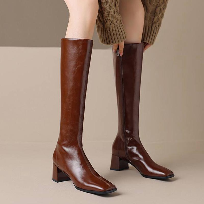 Krazing Pot Зимние сапоги из коровьей кожи с квадратным носком на толстом высоком каблуке, женские винтажные сапоги до бедра на молнии в стиле ретро