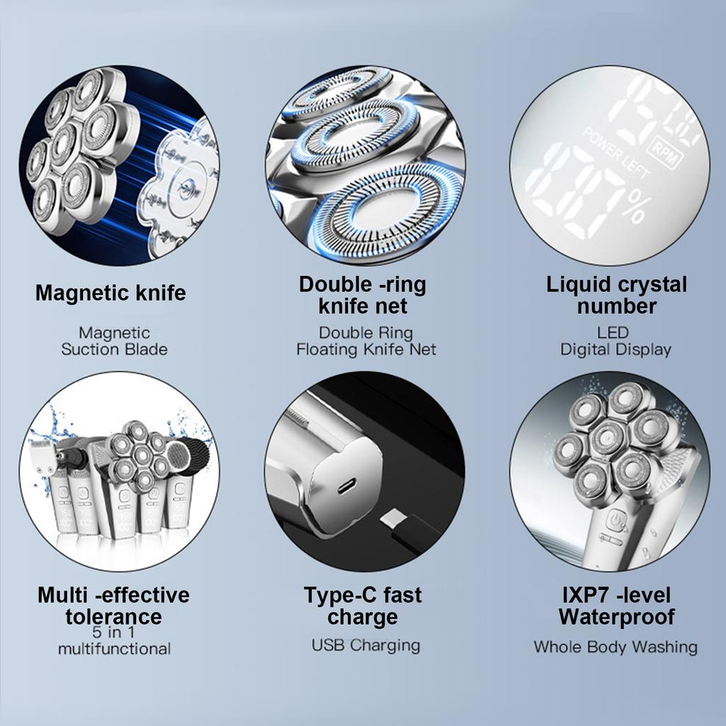 Имеет лезвие с 7 плавающими головками для выдающейся близости и для быстрого и эффективного бритья. Оснащенный полными аксессуарами, он также может работать как машинка для стрижки волос, триммер для носа, массажер для лица и щетка для чистки лица. Высококлассный подарок для любимых мужчин.