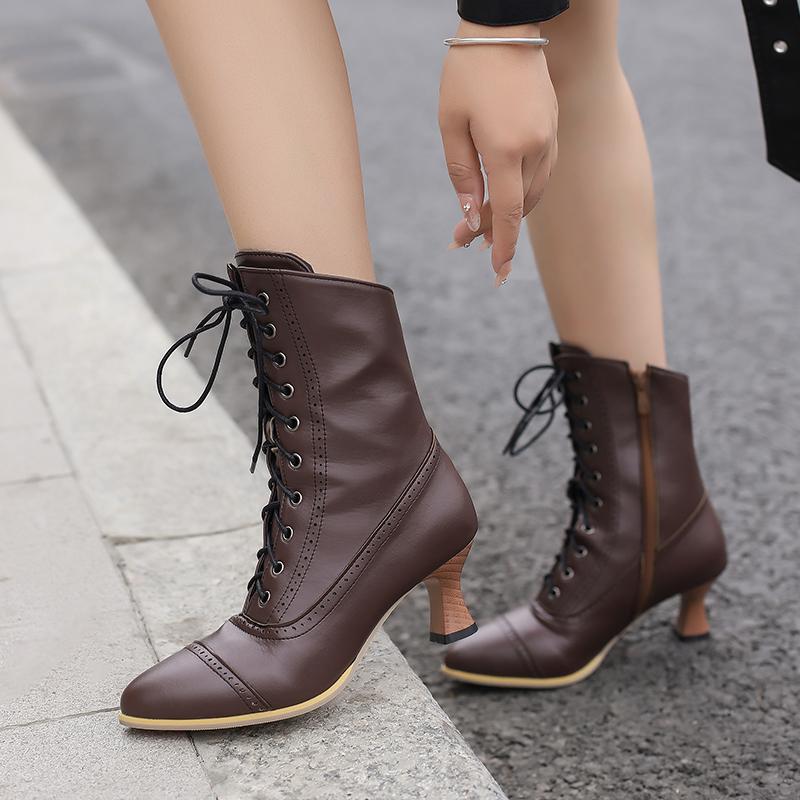 Женские короткие сапоги на высоком каблуке, однотонные остроконечные короткие сапоги в стиле ретро с резным узором, осенне-зимние новые большие женские ботинки — купить товар онлайн с бесплатной доставкой по всему миру!