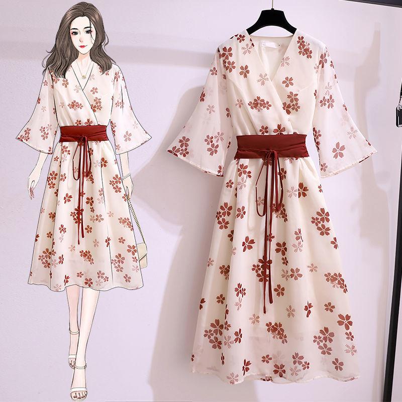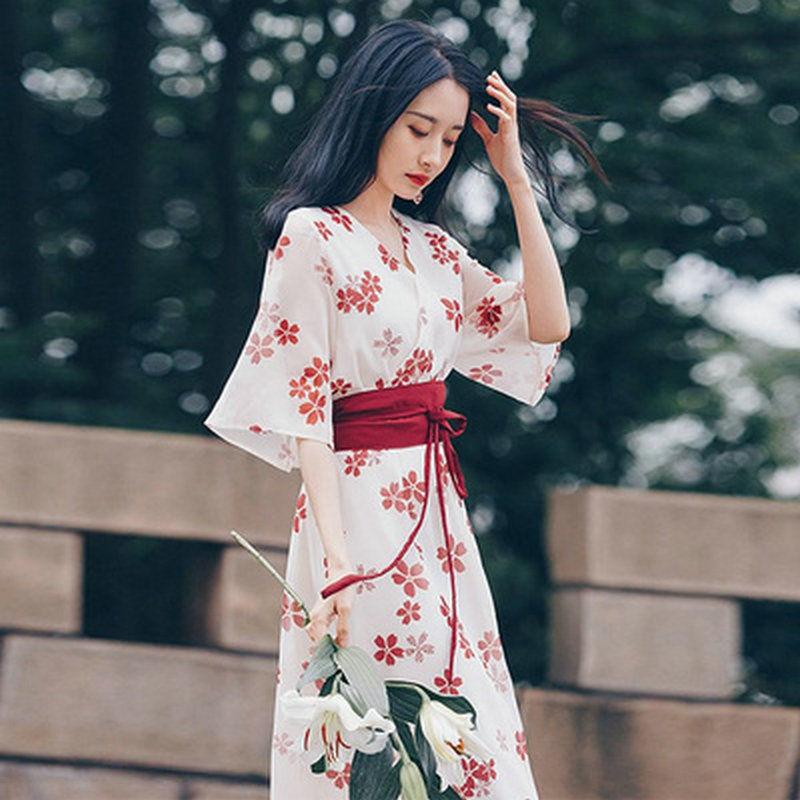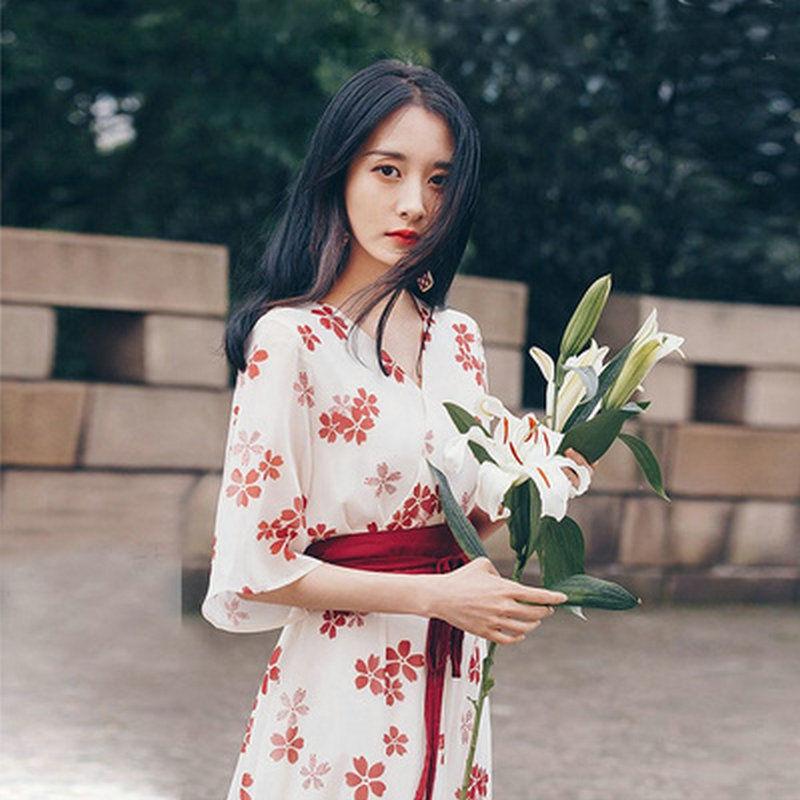 Японское платье, модифицированное кимоно, стиль сакуры, принт гейши, винтажные платья длиной до икры, милая кавайная традиционная одежда, косплей