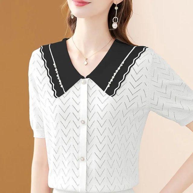 Вязаный топ из ледяного шелка, женский летний новый кукольный воротник с гвоздями и бусинами, ажурная тонкая рубашка S-3XL