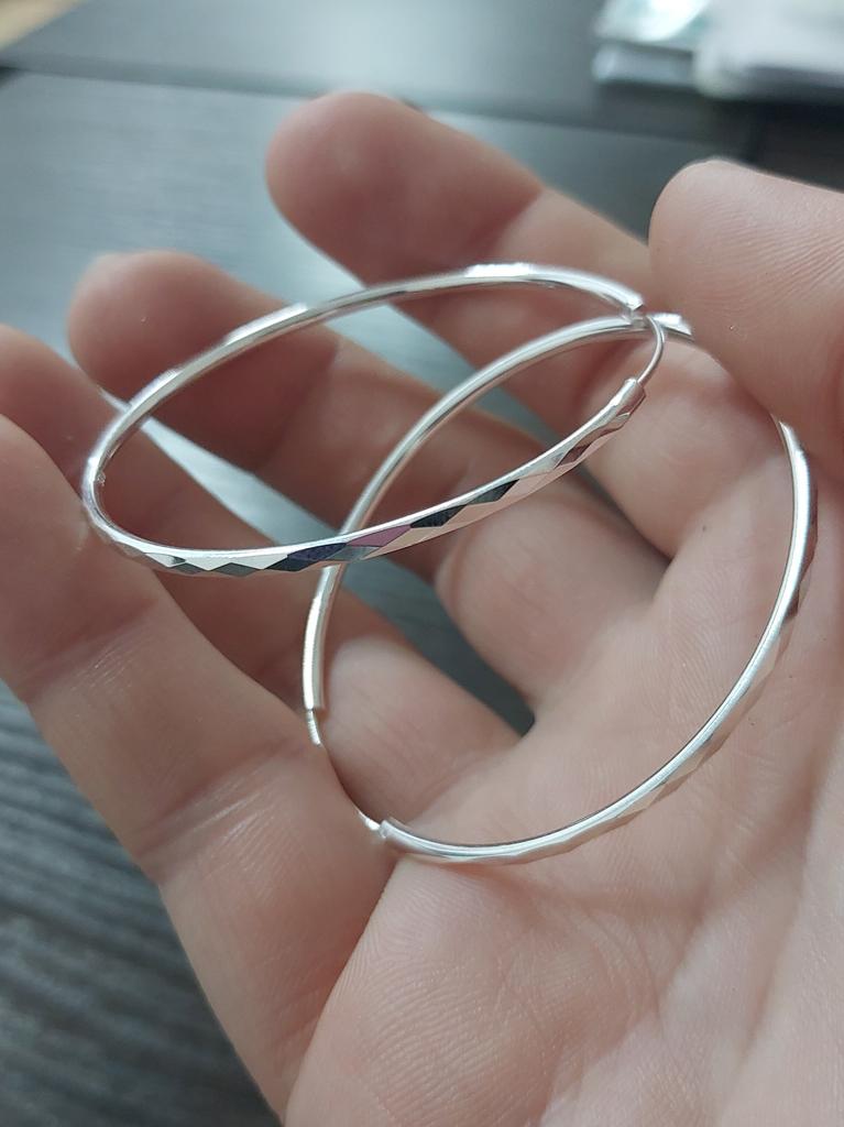 Серьги-кольца из серебра 925 пробы. Вес 1,35 г. Серебро 925 пробы, также известное как стерлинговое серебро, представляет собой сплав, состоящий из 92,5% чистого серебра и 7,5% других металлов, обычно меди. Этот сплав отличается высокой прочностью, пластичностью и привлекательным цветом, а также обладает хорошей износостойкостью. Диаметр серег - 50 мм. На странице продавца представлен сертификат подлинности. Серьги имеют изысканный геометрический рисунок, который добавляет им уникальности и стиля. Для того чтобы сохранить их блеск, рекомендуется носить серебряные украшения регулярно и снимать их перед принятием душа или купанием в водоемах. Я носила эти серьги несколько раз, и они не вызвали никаких раздражений. Они выглядят очень красиво и стильно. С уверенностью рекомендую к покупке!