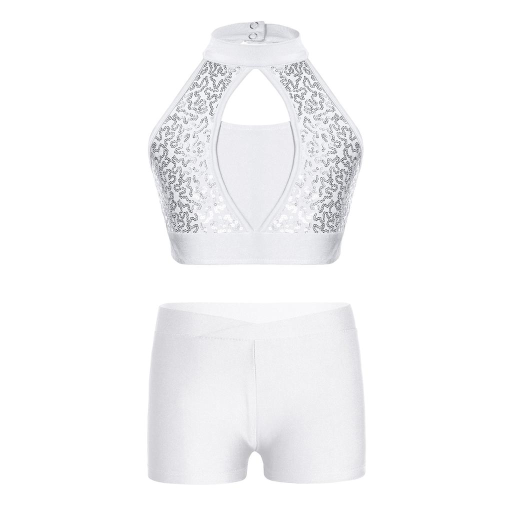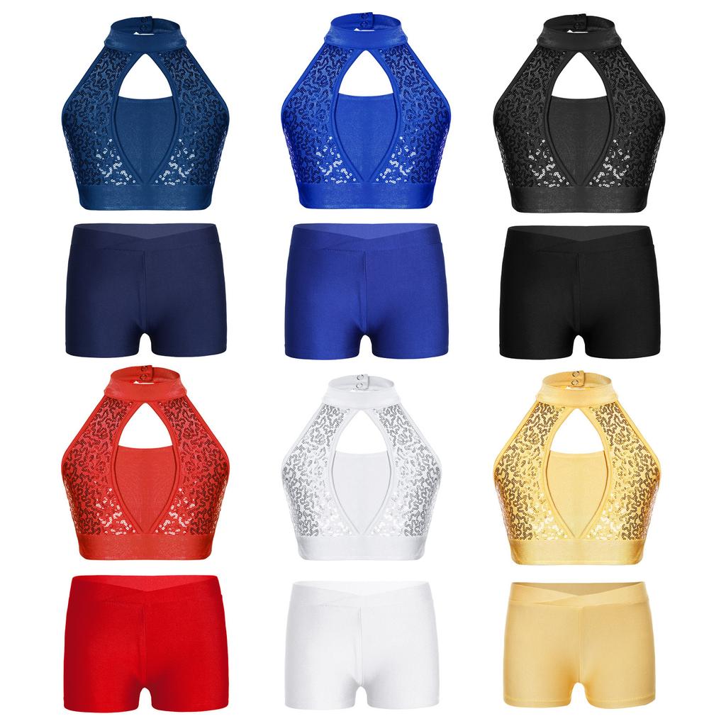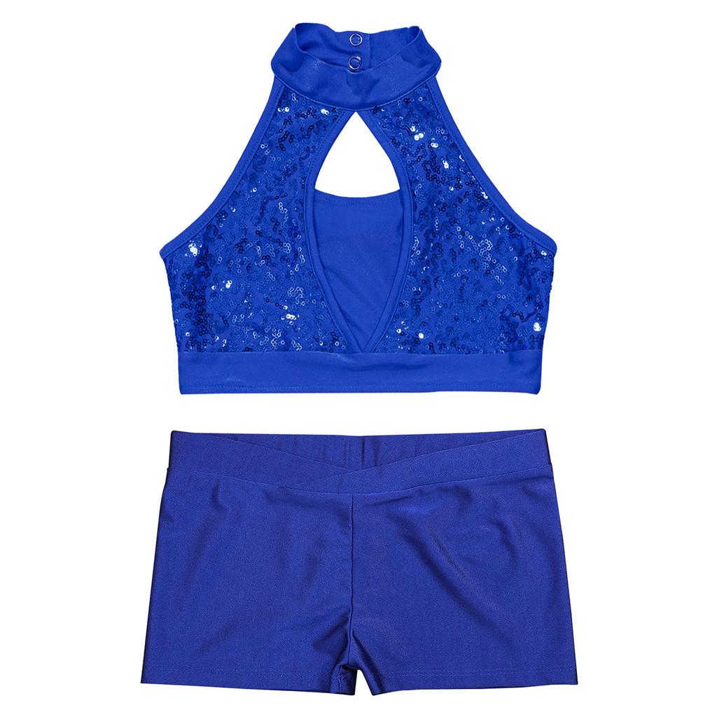 Детский укороченный топ без рукавов с пайетками для девочек и шорты для соревнований по танцевальной гимнастике