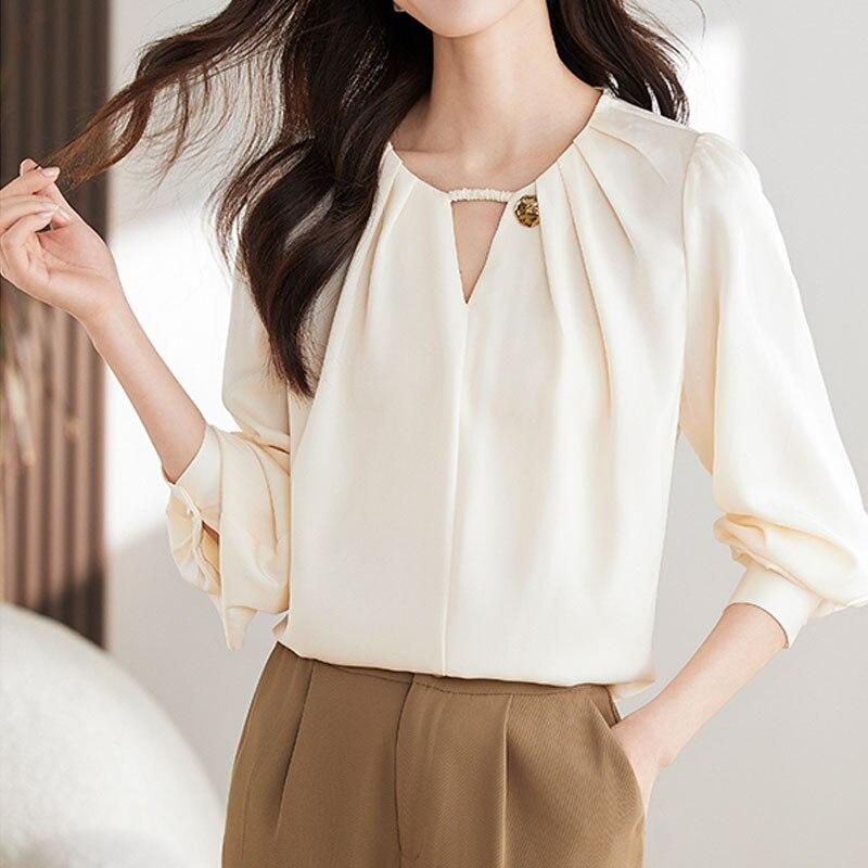 Офисная женская элегантная женская рубашка, модная шифоновая женская блузка с длинным рукавом и v-образным вырезом, женские топы, нижняя женская одежда 29311