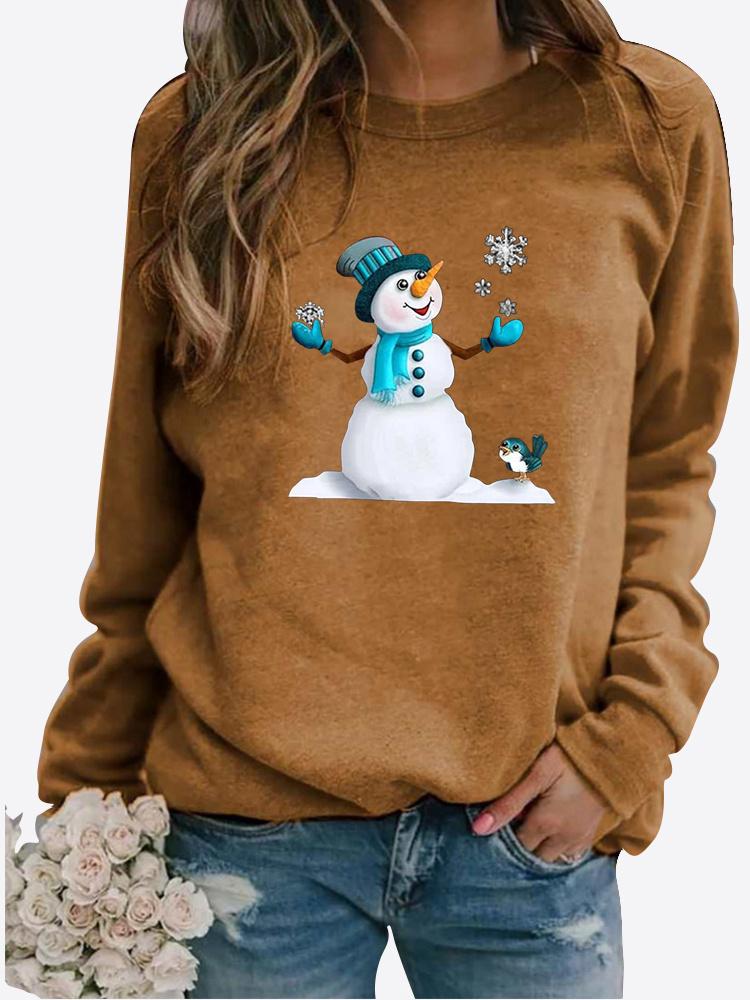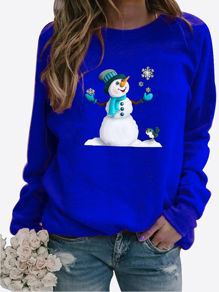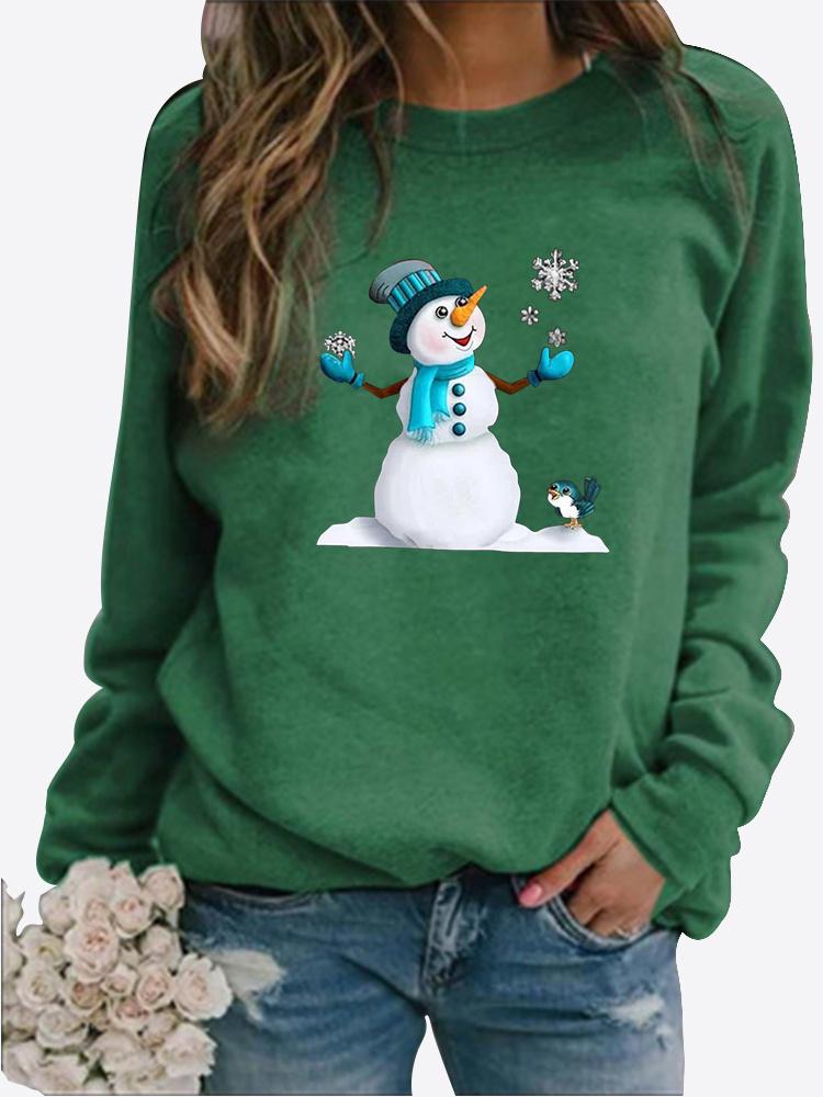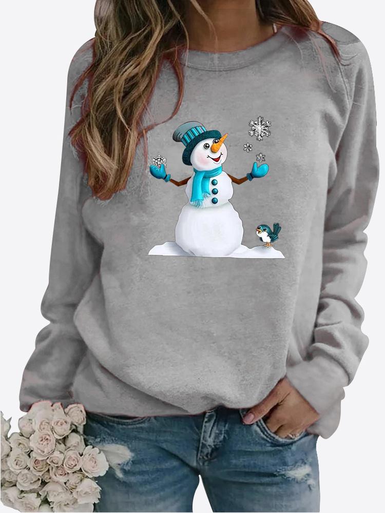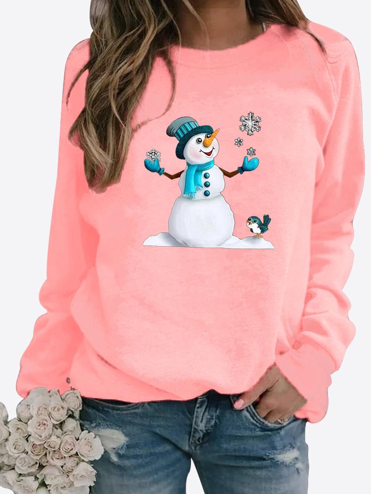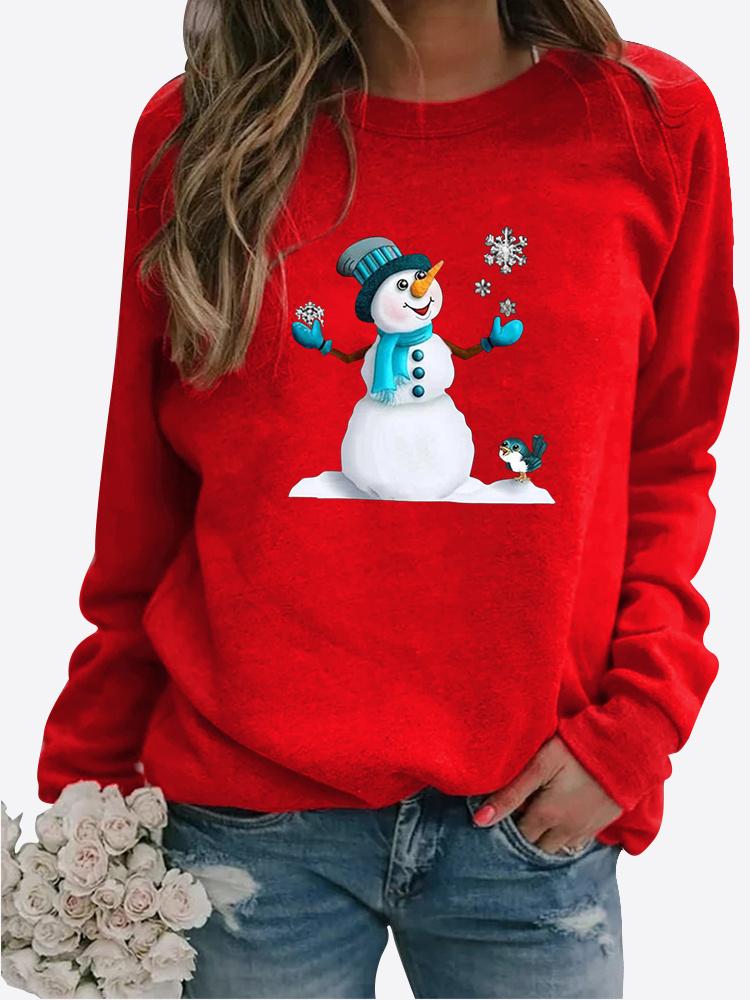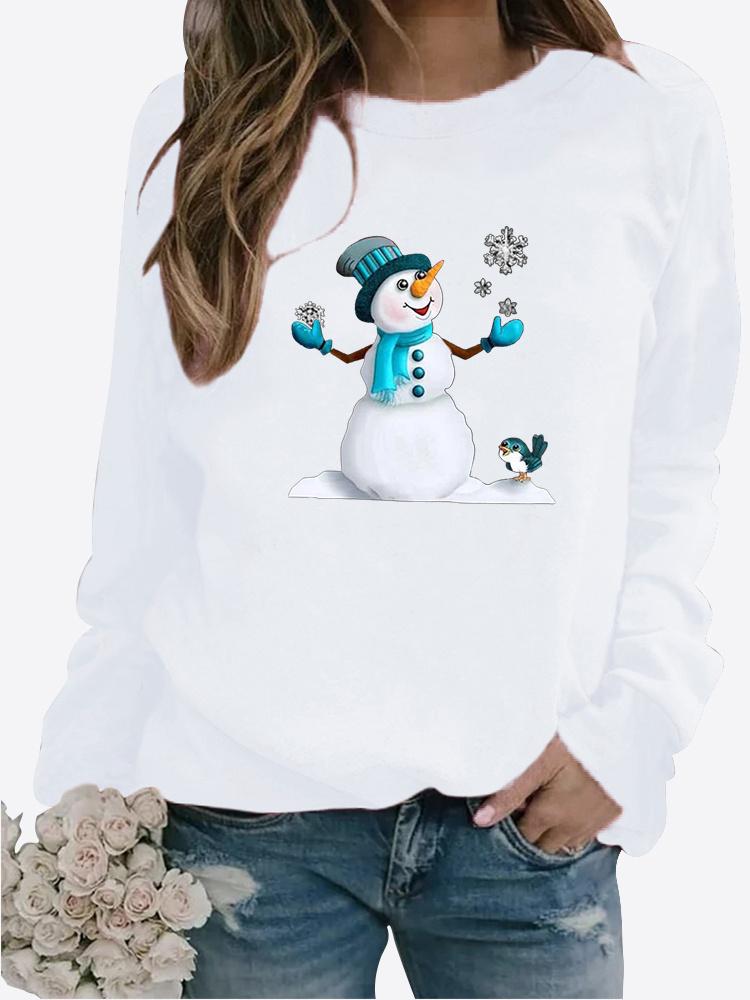 Женская осенне-зимняя повседневная модная однотонная футболка с круглым вырезом и длинными рукавами, с принтом снеговика, свободная блузка, топы