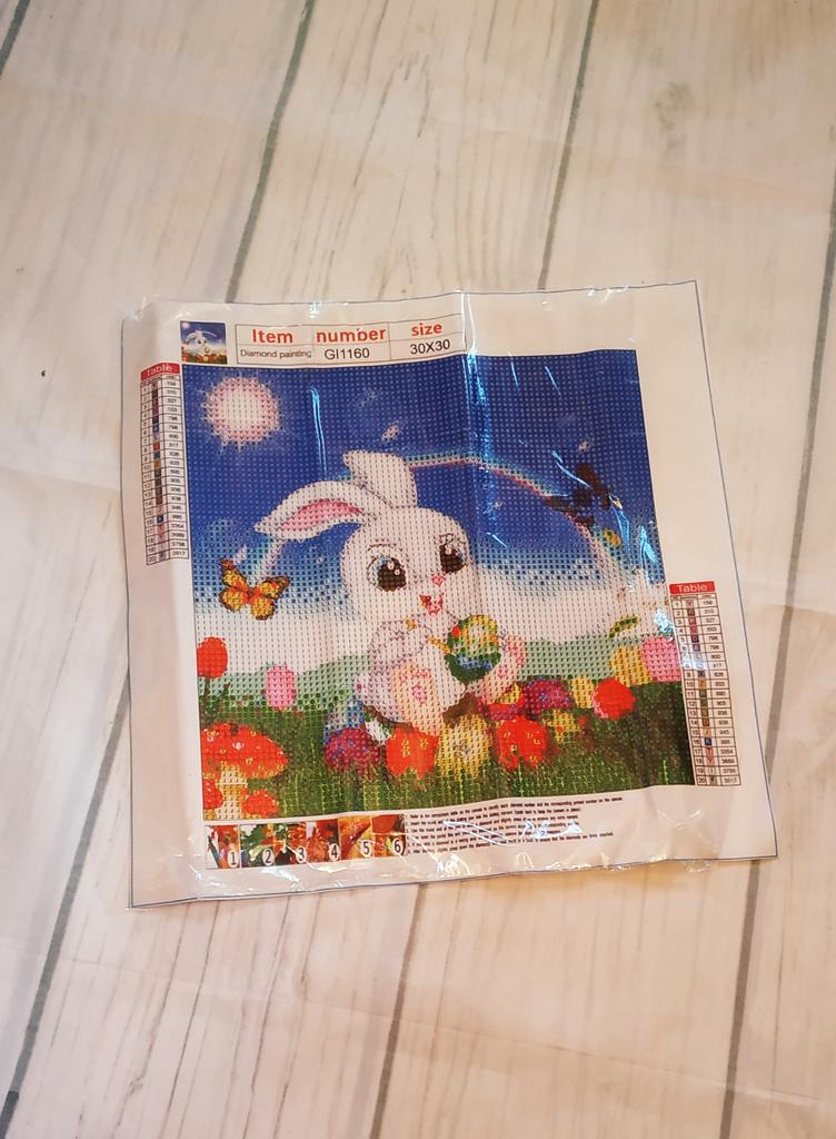 Яркая алмазная картина "Милый кролик" Так как не только я люблю собирать такие картины, а и дочки, то заказала вот такую картинку, которую планируем собрать и повесить в детской. Размер - 30 на 30см. Форма алмазов - круглая. В комплекте идёт: холст, карандашик, маленький лоточек, алмазики, где каждый цвет в индивидуальном пакете и по номерам, всего 20 цветов. На картине в уголку есть нумерация и цвета. Номера на пакетиках с кристалликами соответсвуют номерам на самой картине. Выкладка картины полная. Алмазики и сама основа с яркими цветами. Качество холста хорошее: холст плотный, с хорошей липкой основой. Заказом довольная, рекомендую!