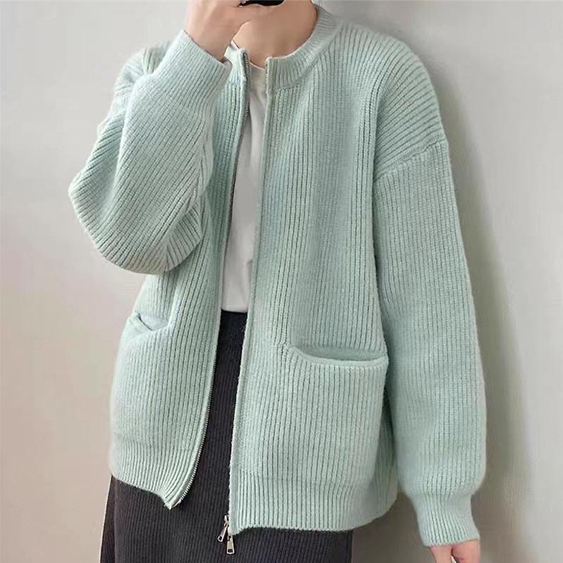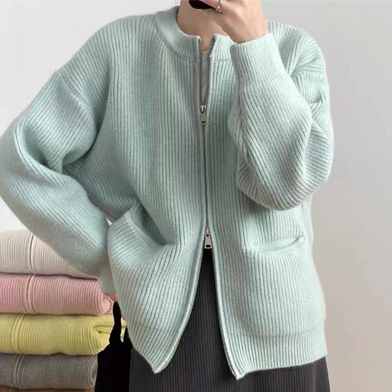 Двойная молния, однотонный свитер, кардиган, женская свободная повседневная вязаная куртка