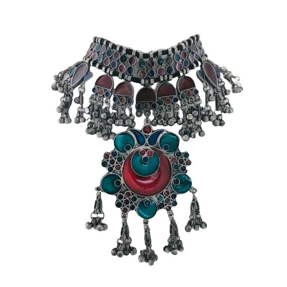 Антикварное серебряное оксидированное этническое тибетско-афганское богемное ювелирное колье-колье с большой подвеской с эмалью Минакари для женщин и девочек — купить товар онлайн с бесплатной доставкой до всему миру!