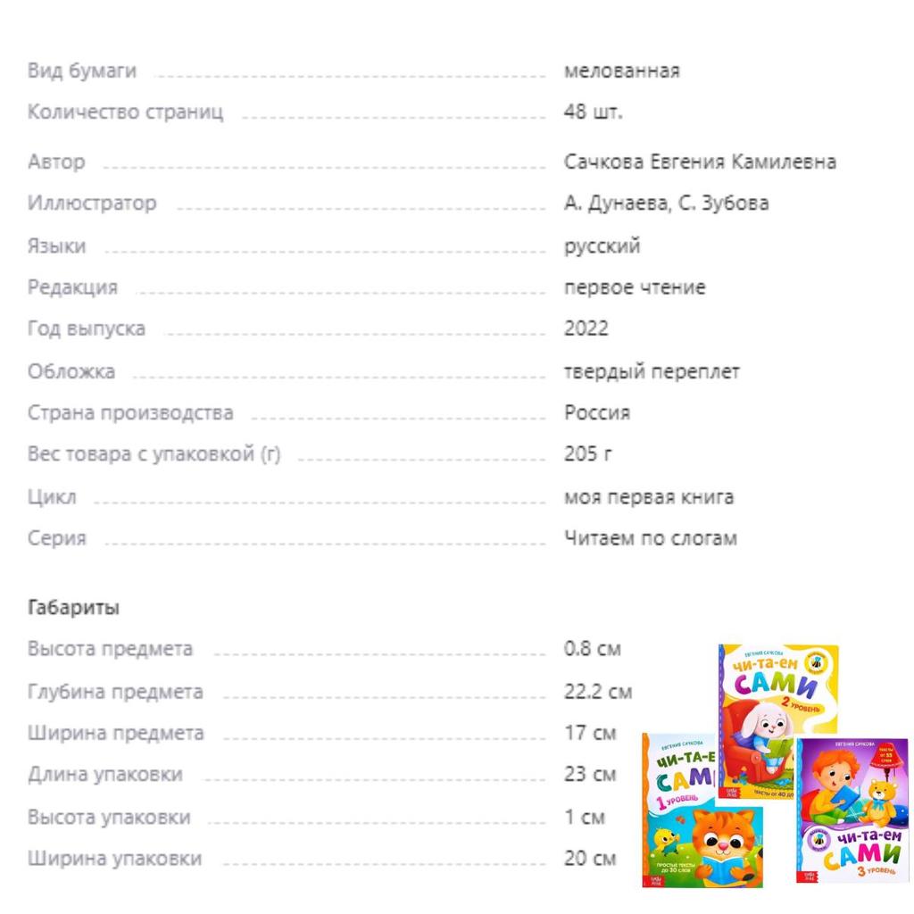 Эта серия — не просто набор книг, это приглашение к сплоченному занятию, где каждый день приносит новую возможность стать свидетелем восхитительных успехов вашего ребенка.. Речь идет о воспитании любви к чтению с самого раннего возраста, поощрении привычки, которая обещает целую жизнь знаний и воображения.. Переход от одной книги к другой происходит плавно, помогая юному читателю пройти обучение в самостоятельном темпе.. Богатство содержания и привлекательность иллюстраций поддерживают любопытство, превращая обучение в увлекательное приключение, а не вынужденную задачу.. С каждой перевернутой страницей волнение усиливается, что делает серию «Учимся вместе» любимым помощником по чтению для вашего ребенка.. 📚