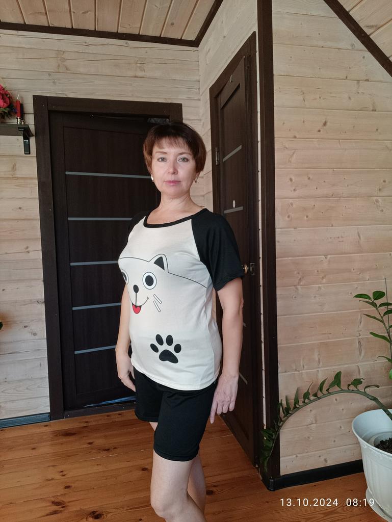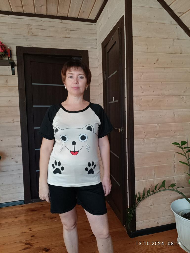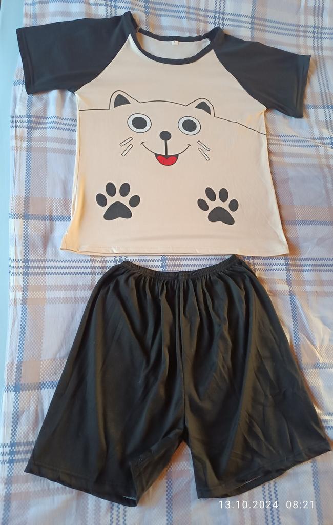 😺Бюджетная пижамка с забавным принтом 😺Очень лёгкая, из синтетики, но для меня она приятная к телу 😺Купила на подарок для девочки- подростка, ей она понравилась 😺Сшита аккуратно, но немного ниточек пришлось обрезать 😺Не линяет, сохнет быстро 😺Размер L на мои параметры 39-94-80-98см, футболка в облипку, а шортики свободно 😺Для своей стоимости вполне норм 😺Наглядно показала и рассказала в видео