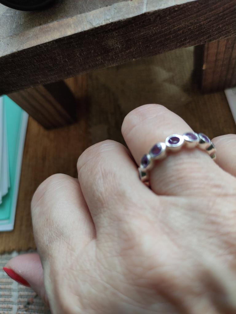 Получила кольцо с аметистом, по всей окружности кольца,камни чистые , аккуратно обработанные,для такого колечка по размеру,не маленькие.Продавца рекомендую,мне очень понравилось колечко,оно нежное,но при этом не громоздкое.Спасибо Джуму и Продавцу.