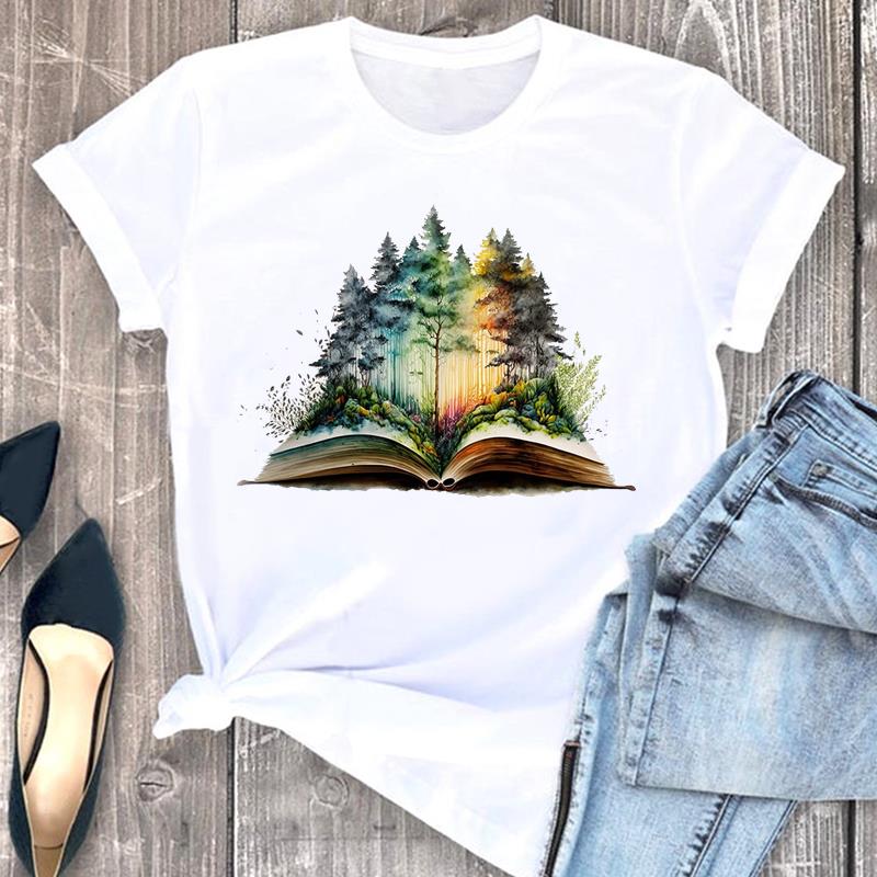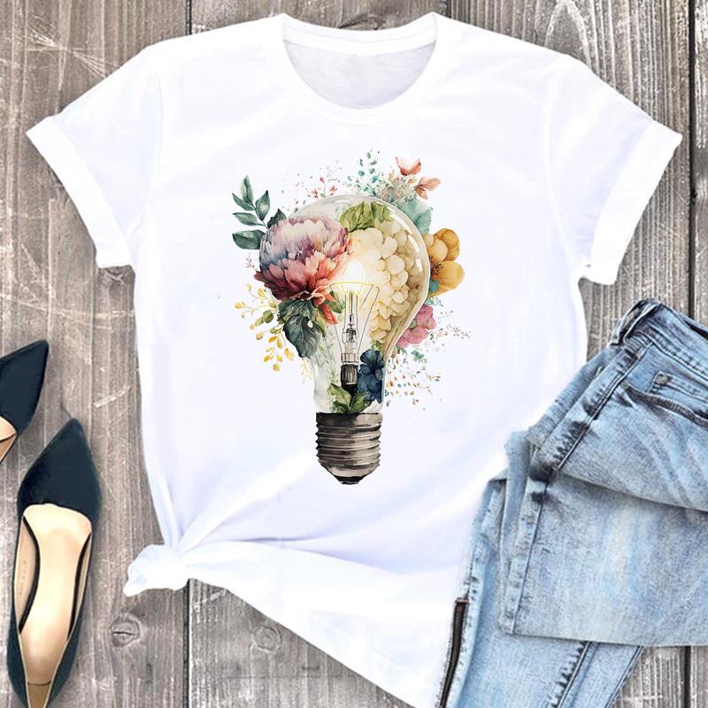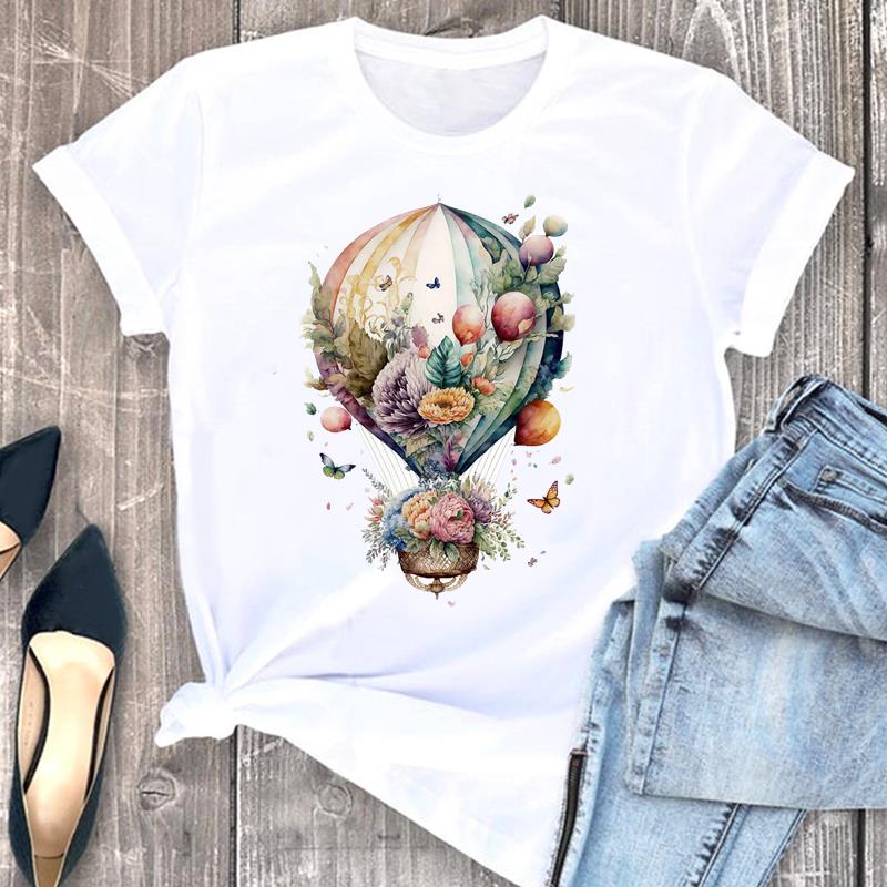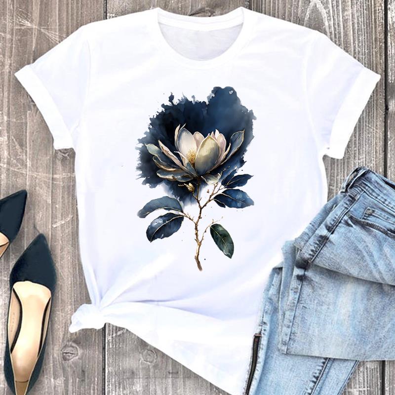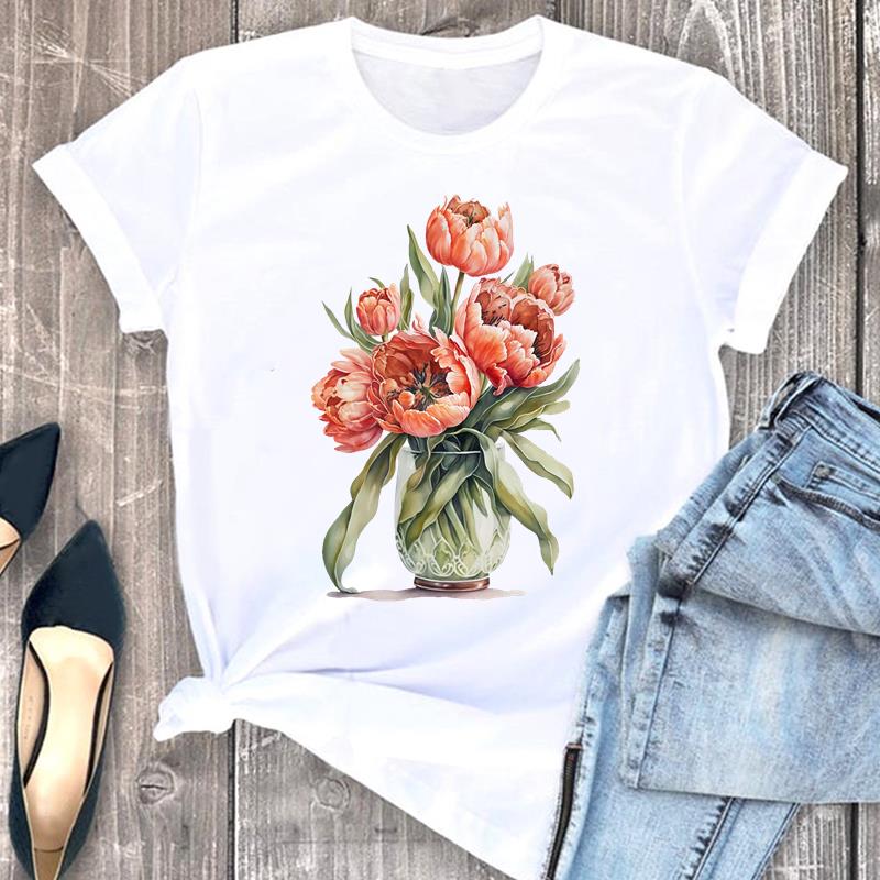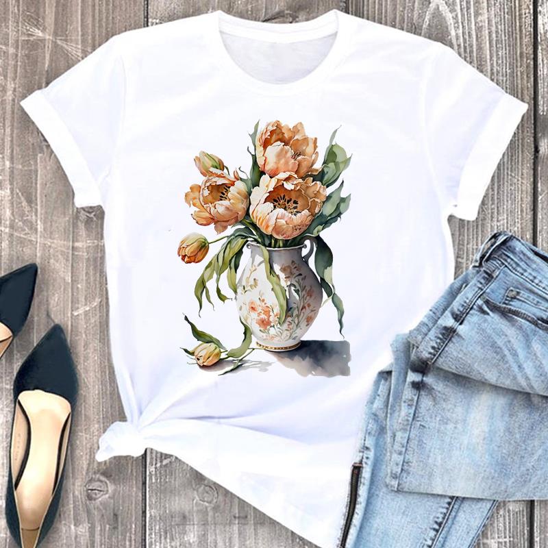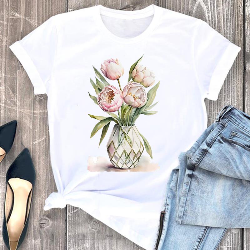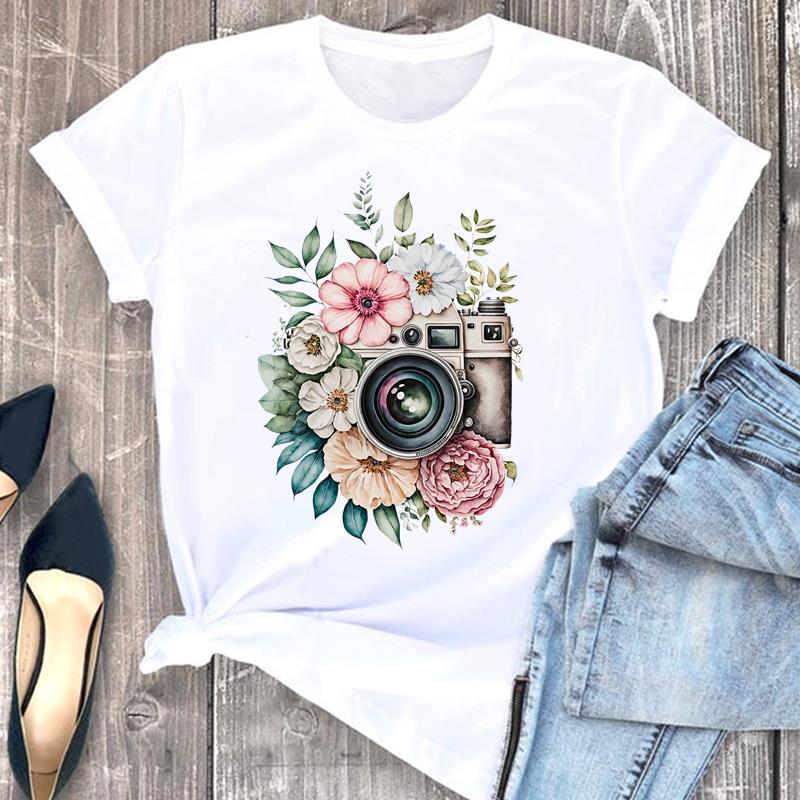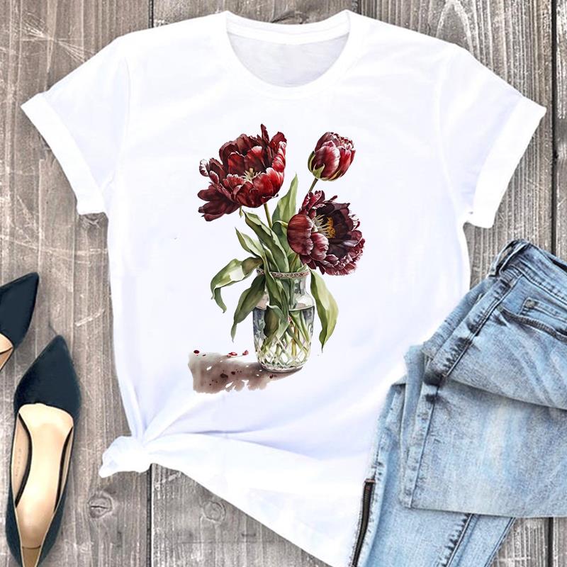 (Азиатский размер) Футболка женская, женская одежда с коротким рукавом, винтажная модная футболка с милым принтом и цветочным принтом, женская футболка