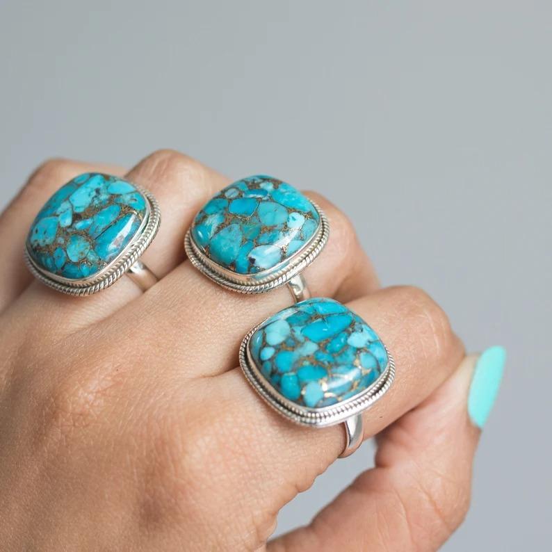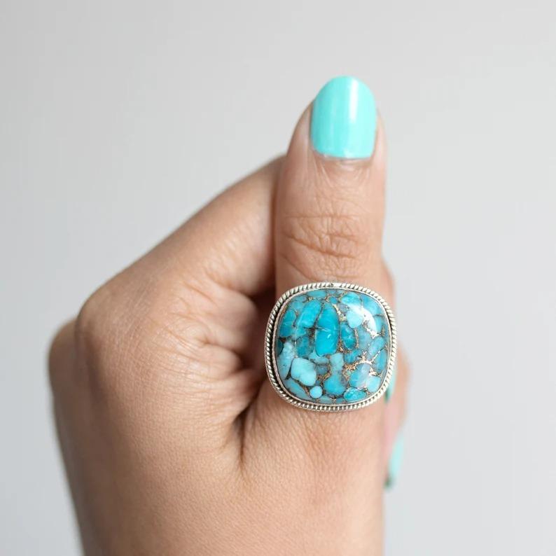Кольцо с драгоценным камнем из лабораторной бирюзы, кольцо из твердого серебра 925 пробы, подарок для нее, кольцо в стиле бохо, кольцо из цельного серебра, ювелирные изделия ручной работы