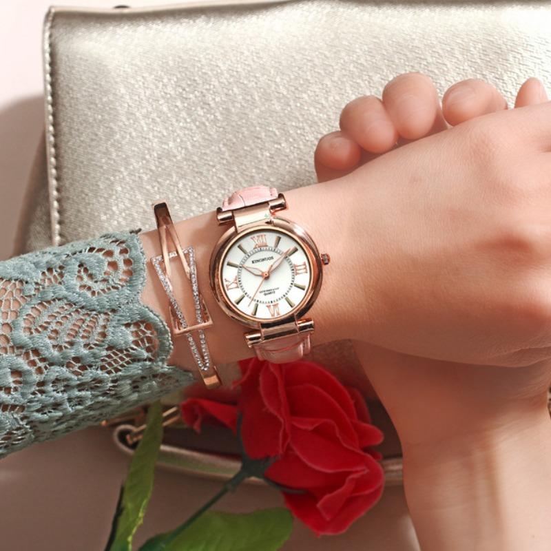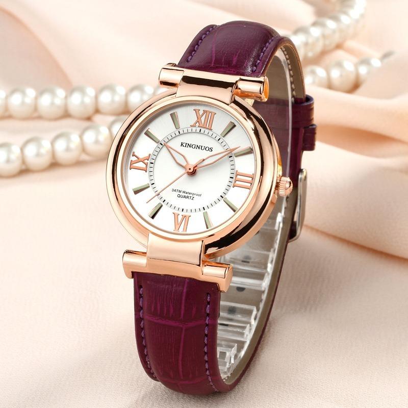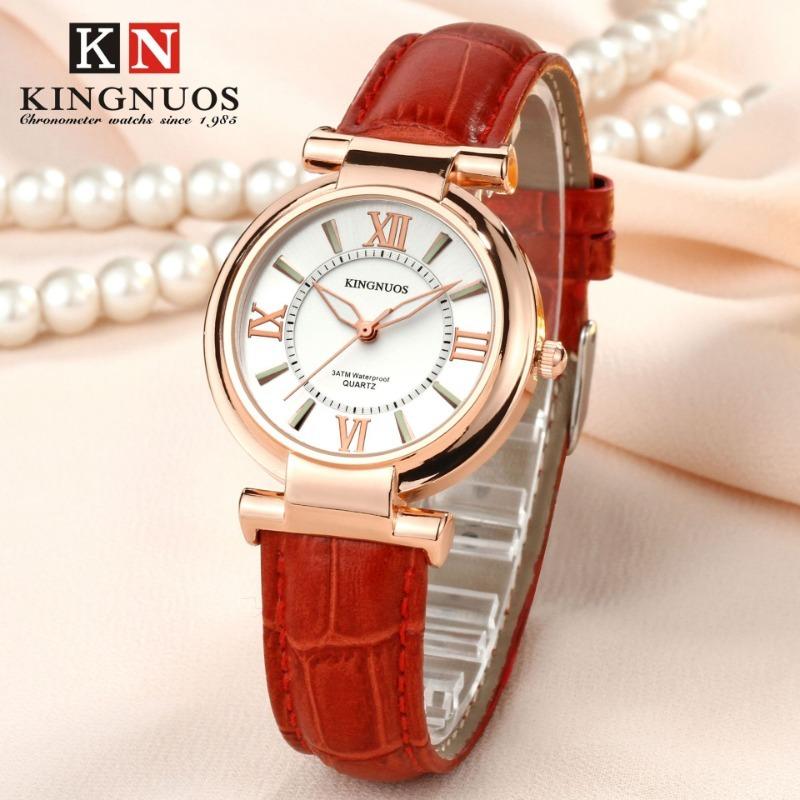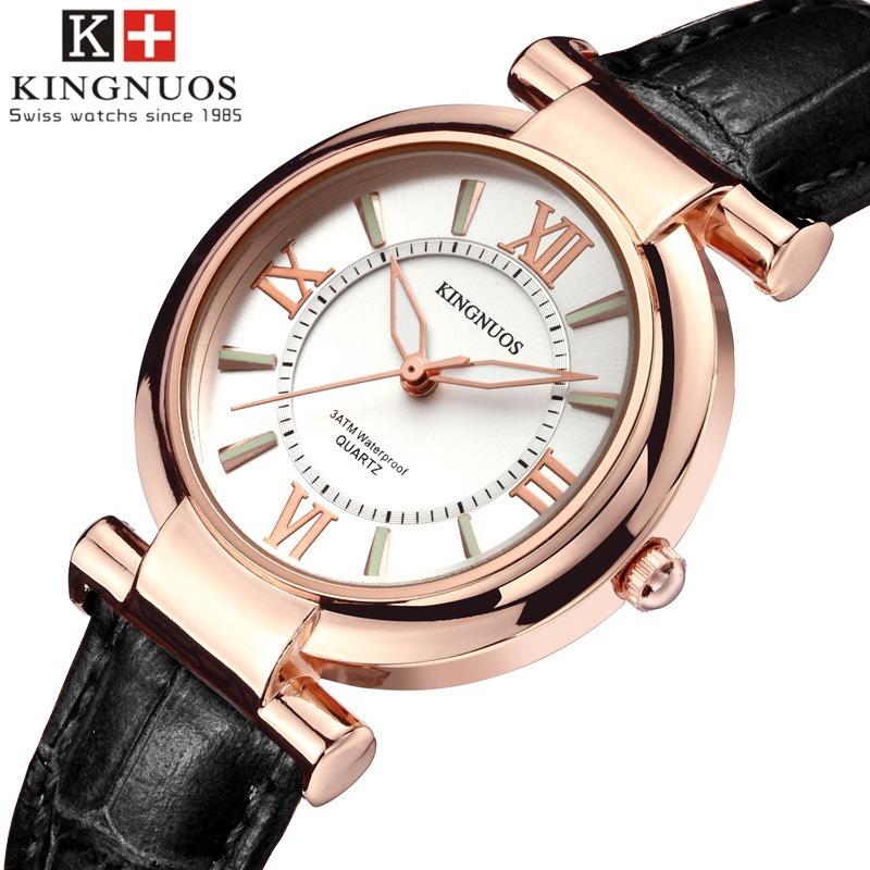 KINGNUOS модные женские часы с римскими цифрами, розовое золото, женские светящиеся водонепроницаемые часы с кожаным ремешком