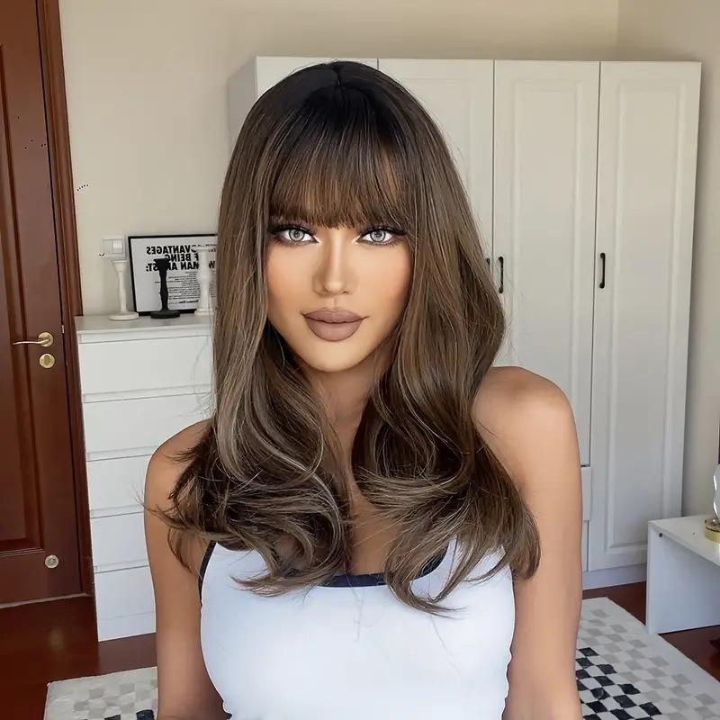 Парики средней длины с челкой, синтетические накладные волосы, натуральный омбре, блондинка, коричневая волна, парик боб для женщин, парик из термостойкого волокна