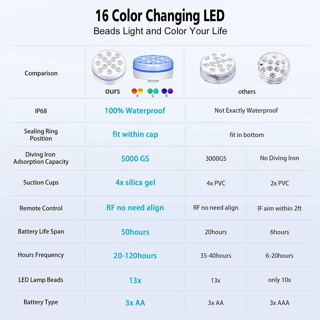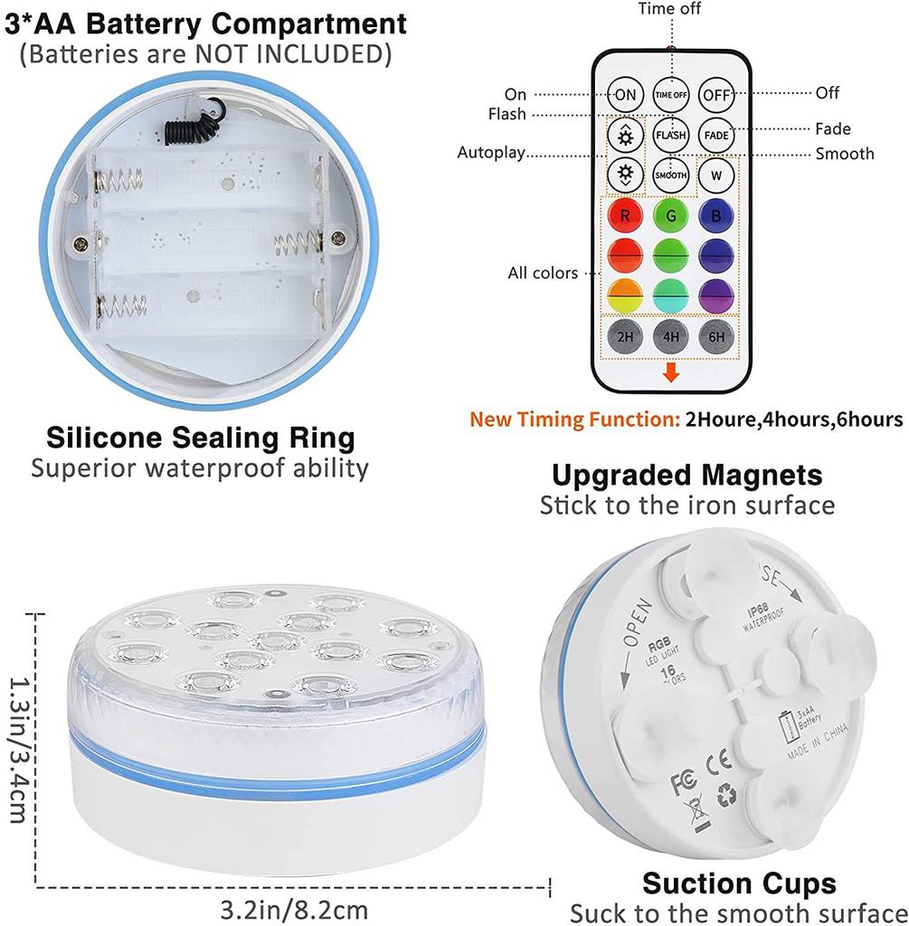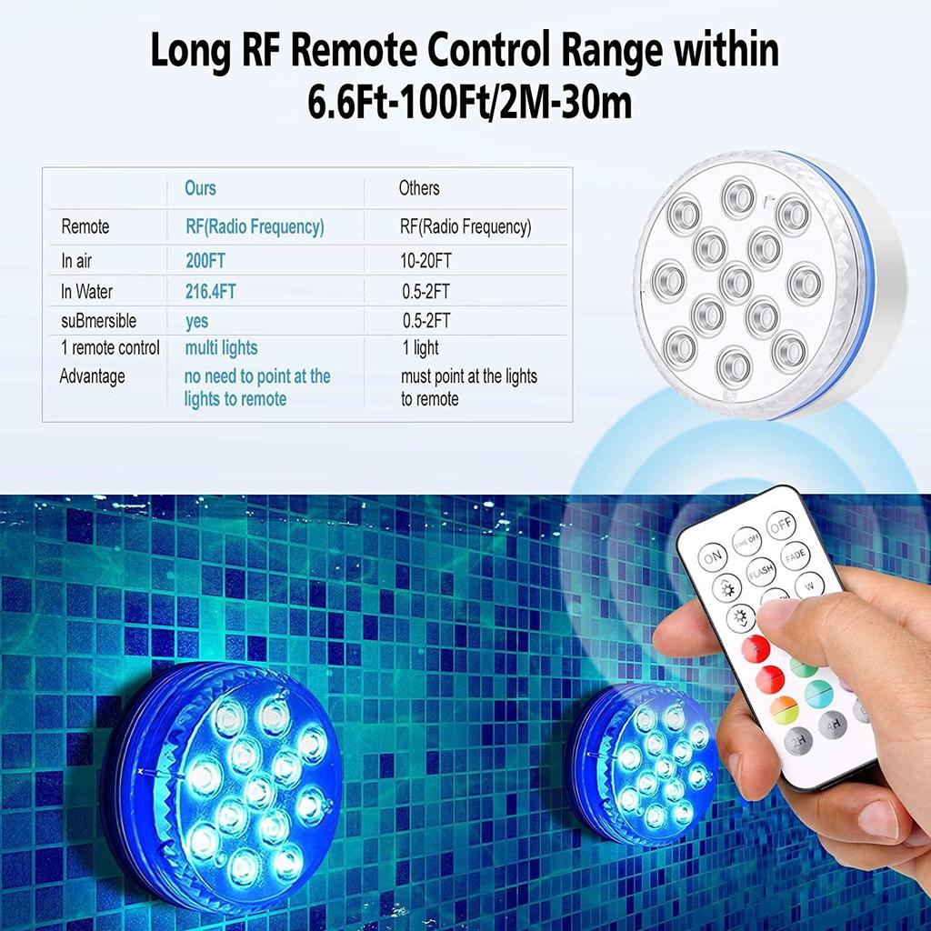 【Многоцелевой】Наши погружные светодиодные фонари могут использоваться для бассейнов, гидромассажных ванн, аквариумов, вазы, цветочного горшка, водопада, фундамента, ледяных скульптур, освещения вечеринки / мероприятия, праздничного акцентного освещения и т. Д.