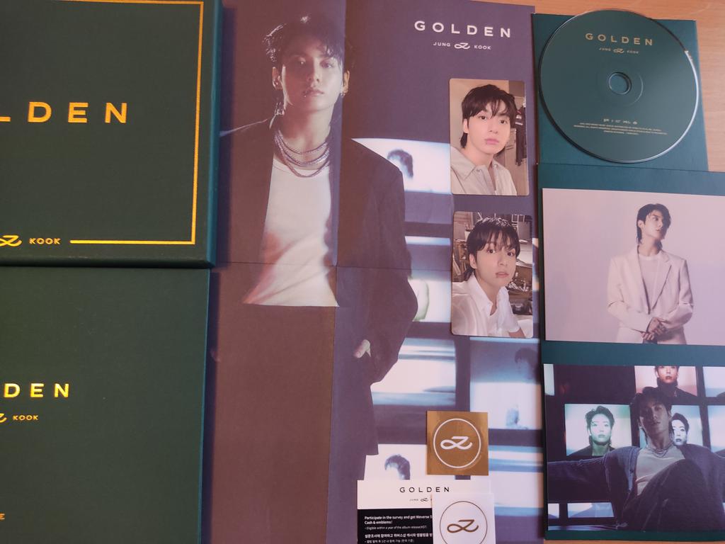 Посылка дошла до Новосибирска меньше чем за месяц. Отслеживалась. Упаковка коробка + пупырка, без повреждений. Альбом Чонгука Golden, версия Shine. 🐰 •Альбом приятный на ощупь, в твёрдом переплёте, как книга. Золотые буквы на нём мерцают мягким светом. Качество печати и дизайн на высоте. • Всё наполнение присутствует: фото-лирик бук; в отдельном конверте - диск; постер, 2 открытки; 2 фотокарты (рандомные); 2 стикера и карточка с Weverse shop. • Качество отличное. Доставка быстрая! 정국이 잘생긴 💜💜💜