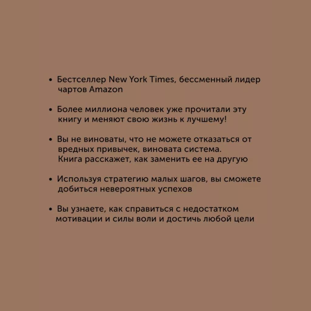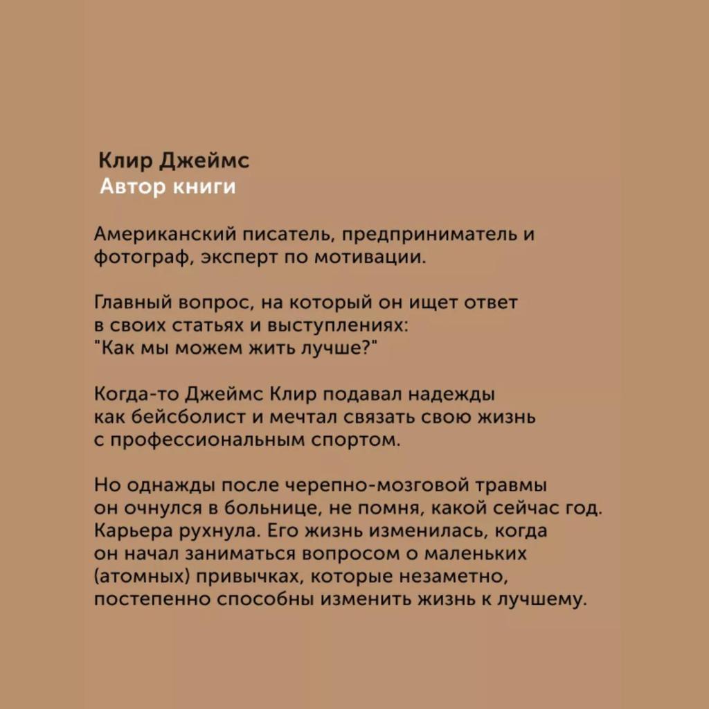 Основываясь на научных исследованиях, обширных исследованиях, личном опыте и мудрости успешных людей, Clear предлагает четкое и простое руководство о том, как сделать хорошие привычки неизбежными, а плохие – невозможными – никаких оправданий! Джеймс Клир — известный американский писатель, предприниматель, фотограф и гуру мотивации.. Его основные поиски, отраженные в его статьях и выступлениях, вращаются вокруг одного существенного вопроса:: «Как мы можем жить лучше?"