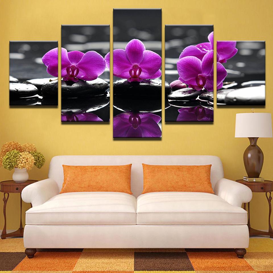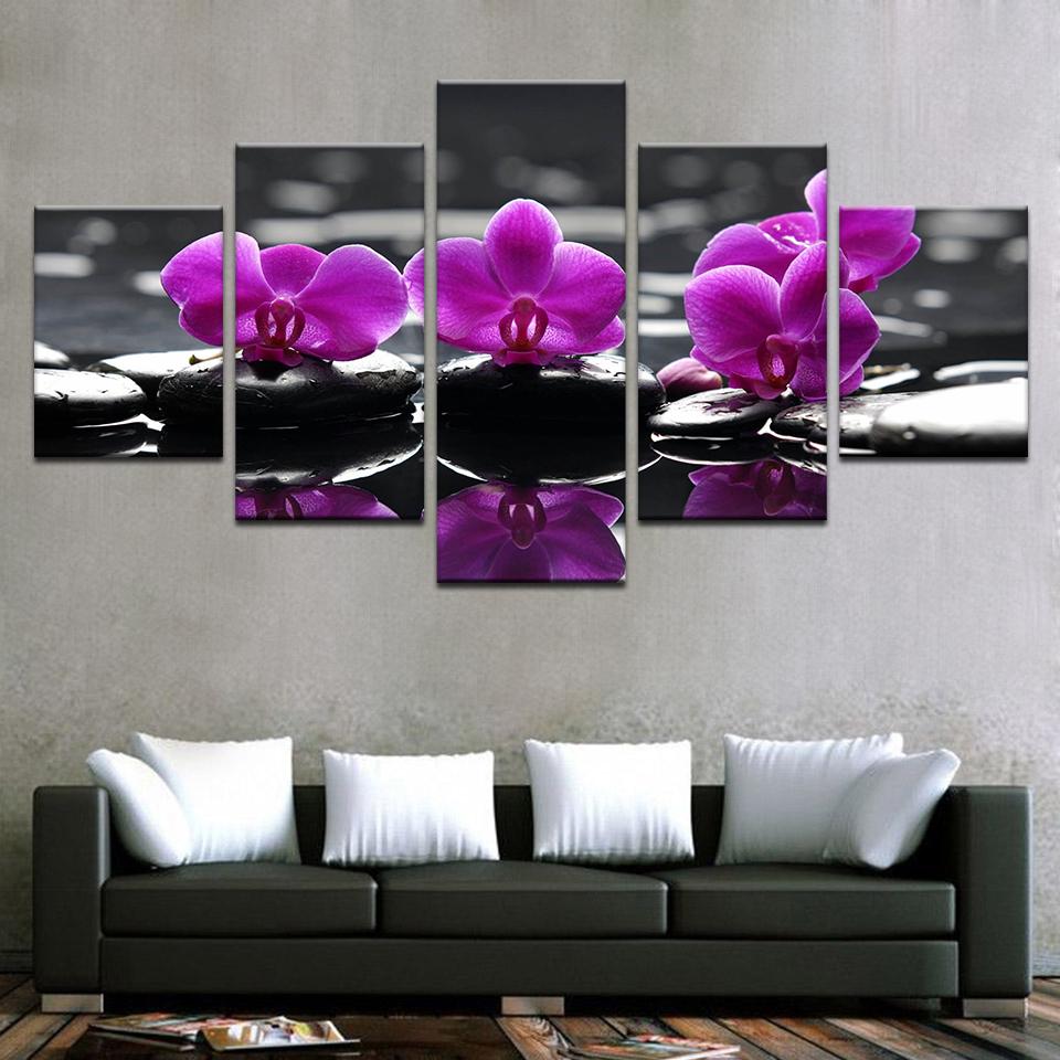 Модульные картины для гостиной, настенное искусство, декор на холсте, 5 шт., спа-камни, мотылек, цветы орхидеи, картины с HD-печатью, в рамке, без рамки