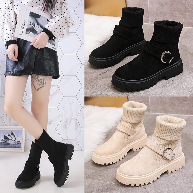 Модные вязаные пинетки, женская обувь, зимние бархатные ботинки с пряжкой на ремне, ботинки на платформе, ботинки в британском стиле