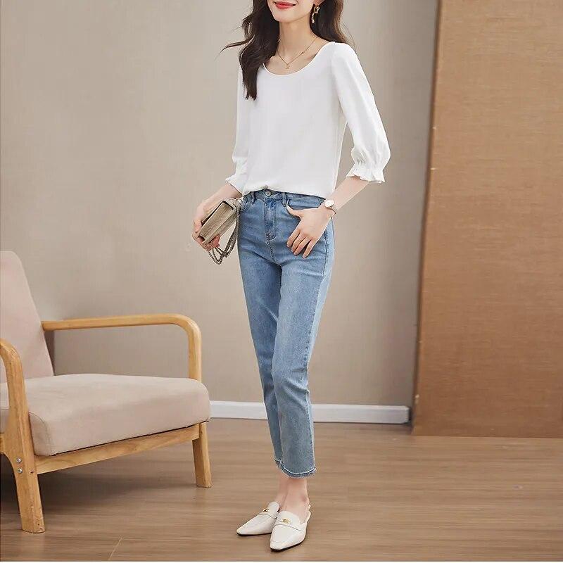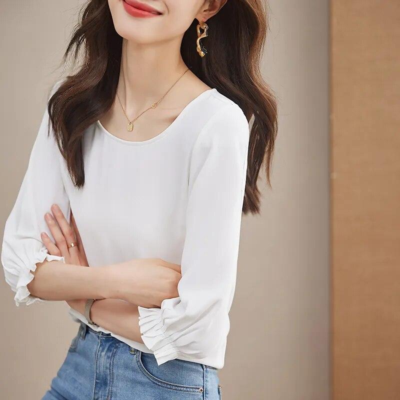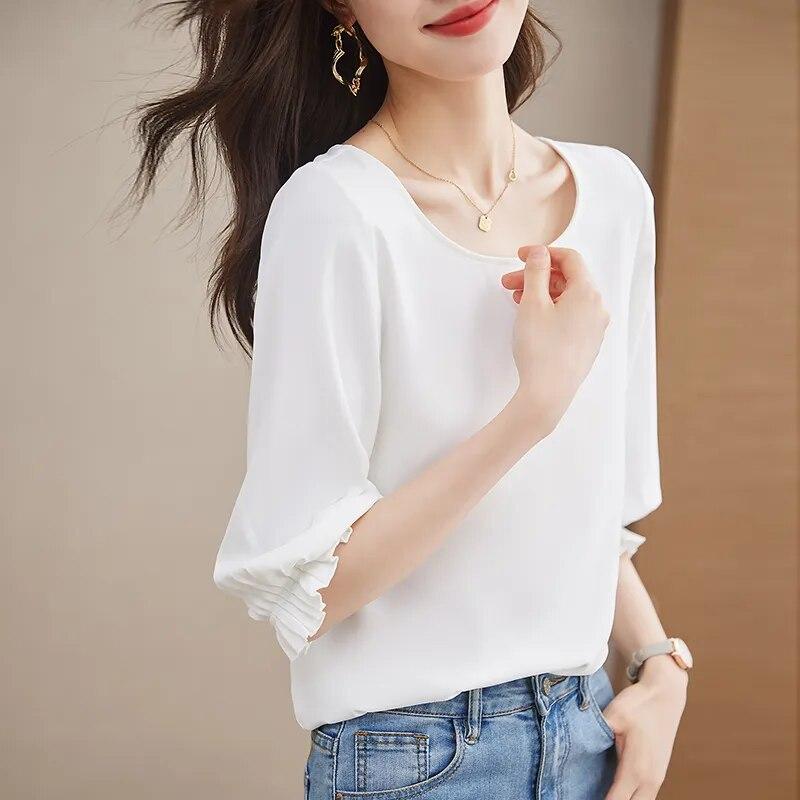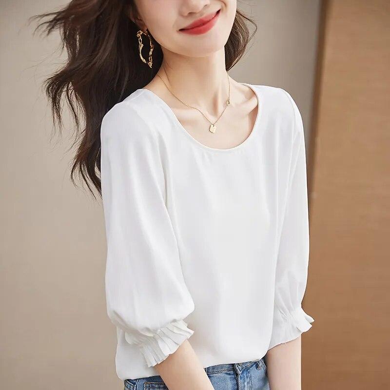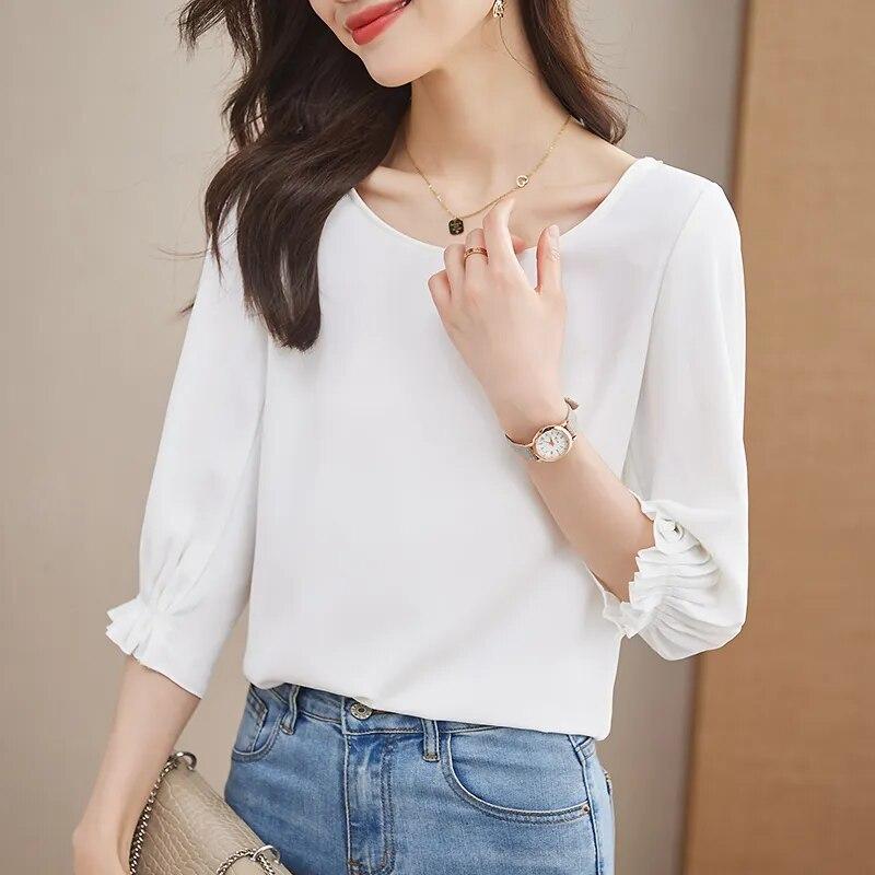 Модные шифоновые женские рубашки с круглым вырезом, топы с рукавами три четверти, женские офисные женские блузки, белая женская одежда 29467